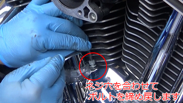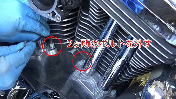 タペットブロックの中央の奥のボルトをそれぞれ外します。先程組み合わせたパーツをセットして、先程外したボルトを使用して装着していきます。