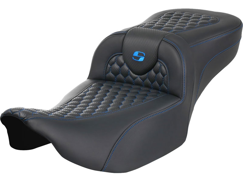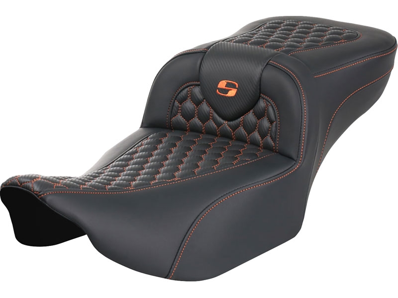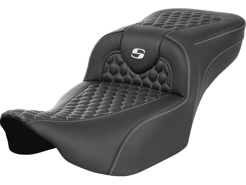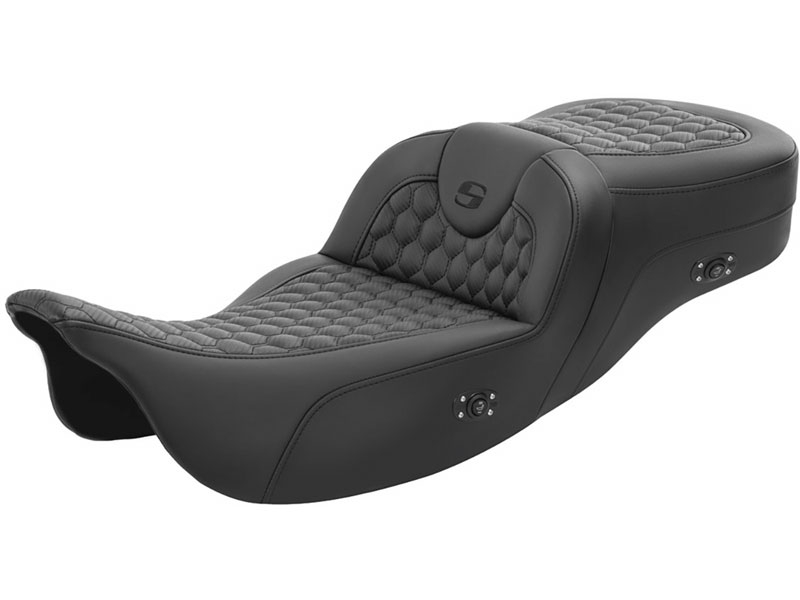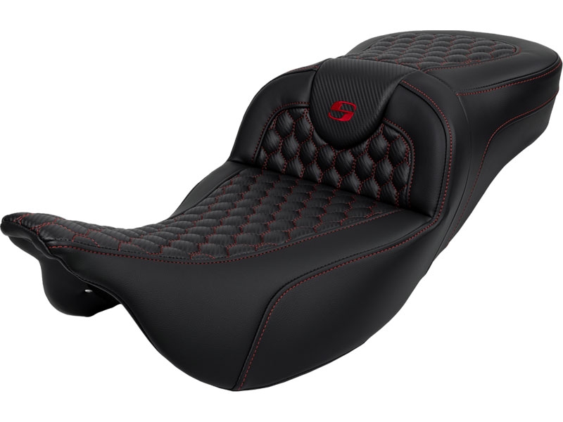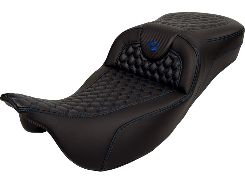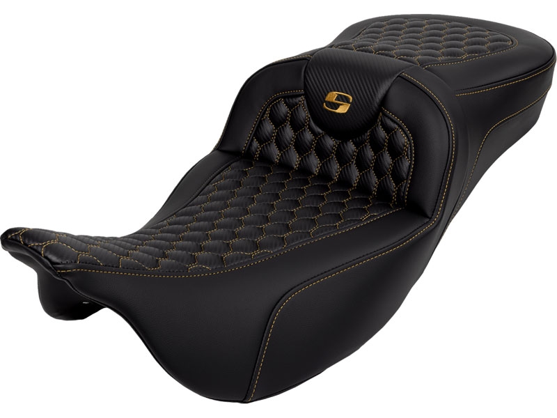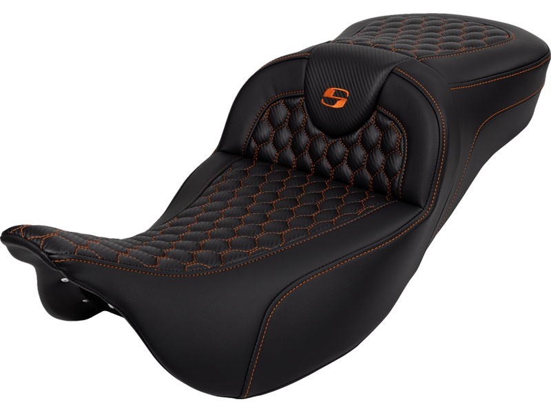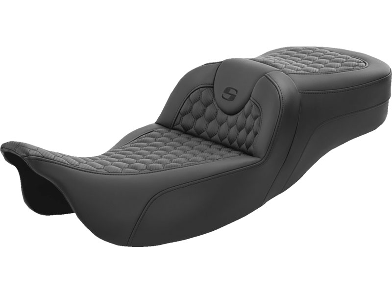 モダンな幾何学模様のハニカム(HoneyComb)パターンのステッチが入ったROAD SOFAシートのライダーバックレスト付きモデルで、着座位置が2インチ(約5cm)後方に下がるエクステッドリーチシート。