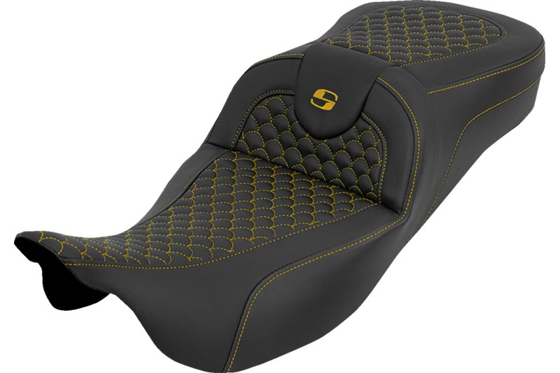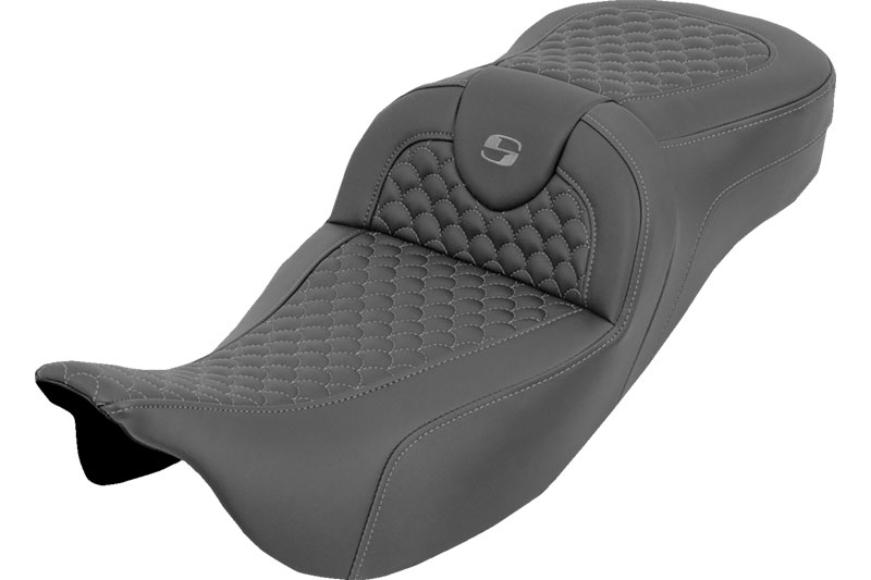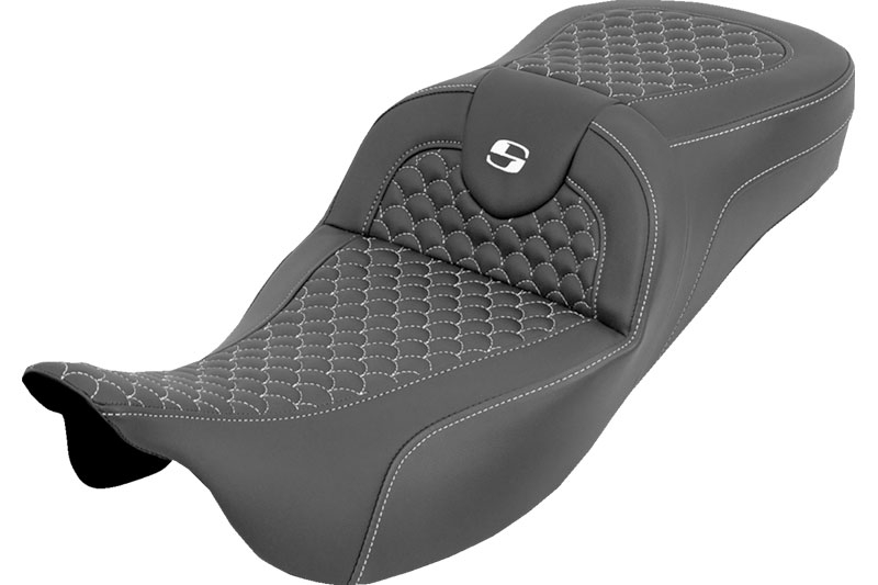 龍のうろこ(Dragon Scale)を思わせるパターンのステッチが入ったROADSOFA DS シートで、着座位置が2インチ(約5cm)後方に下がるエクステッドリーチシート。