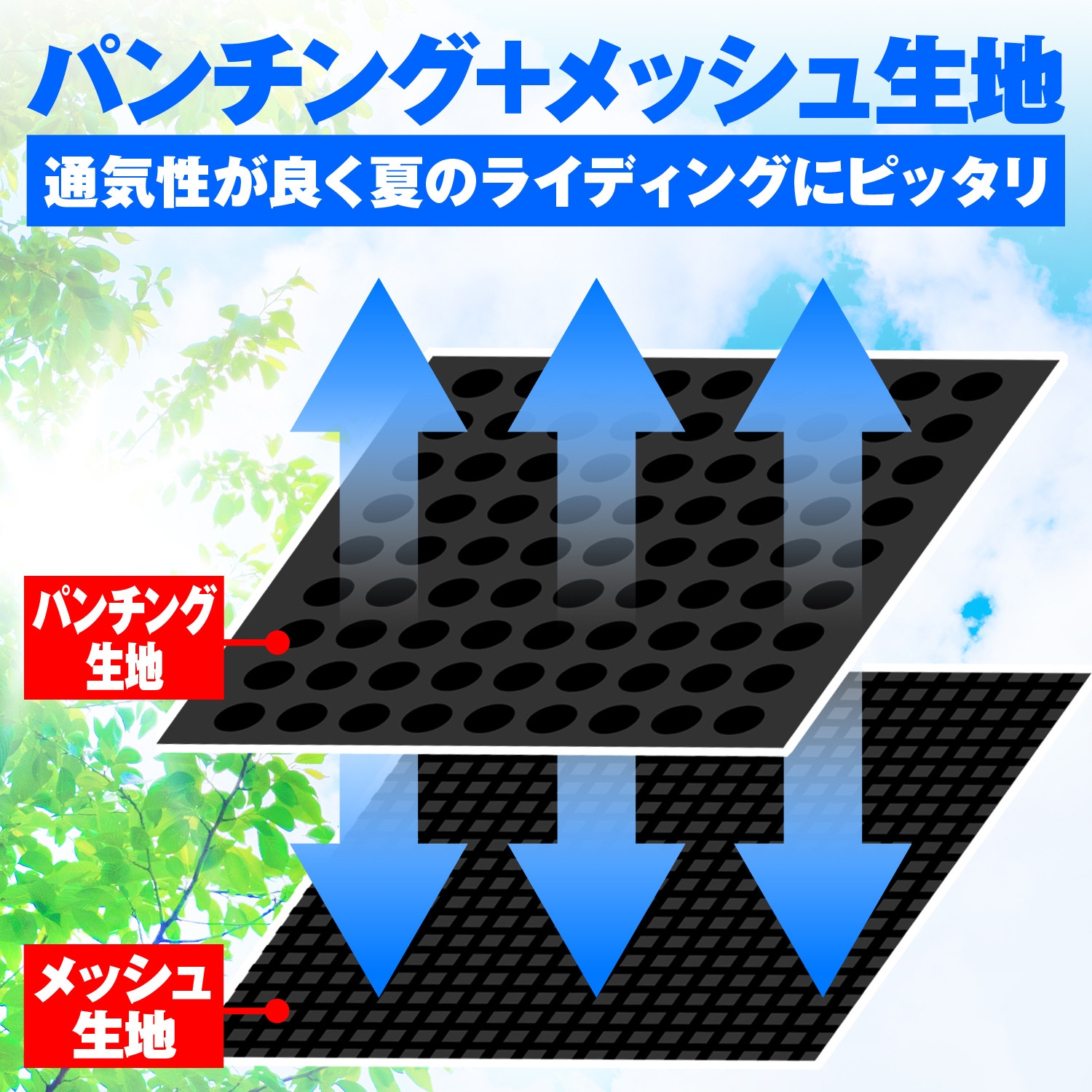 パンチング加工を施した本革とメッシュ生地を組み合わせ、高い通気性と安全性を両立。