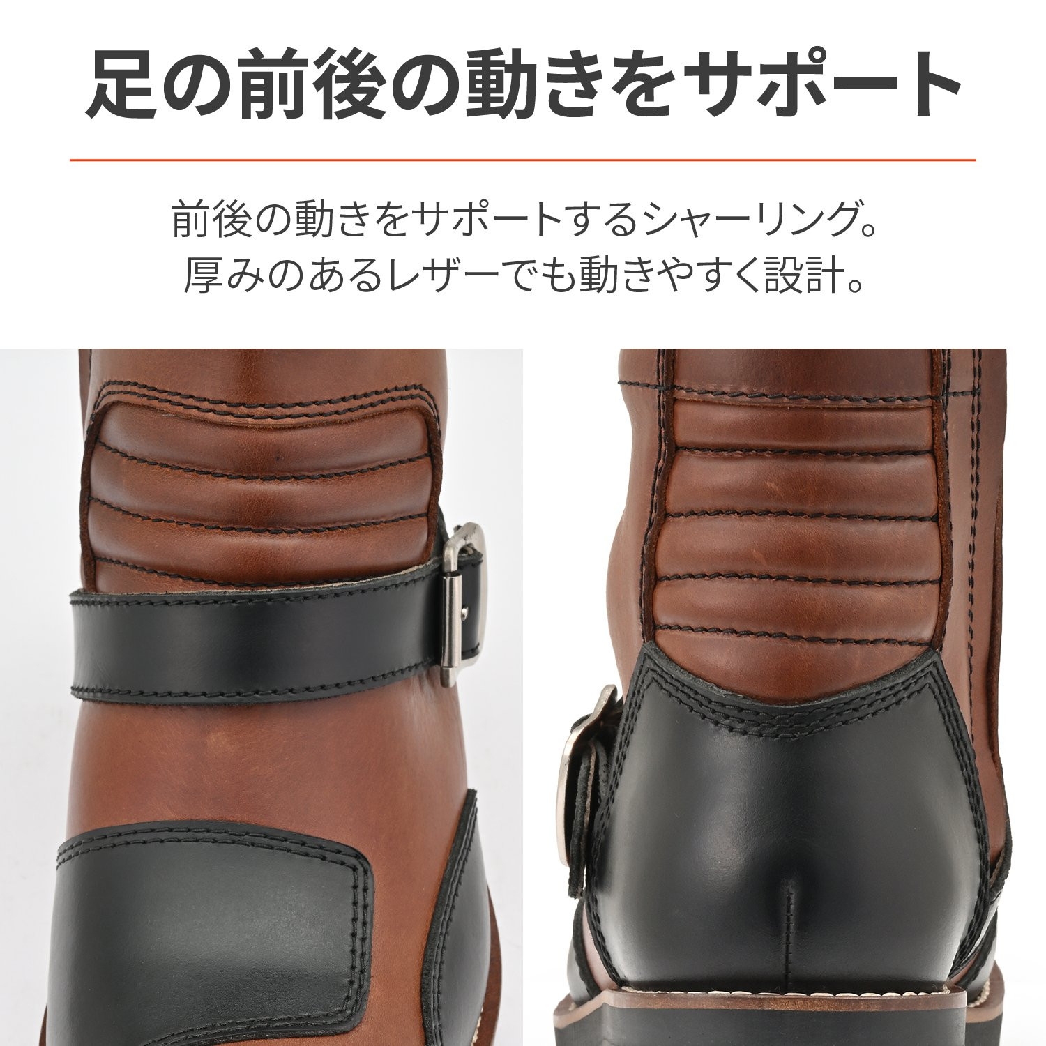 シャーリングを入れることで前後の動きをサポート、厚みのあるレザーでも動きやすく設計。
