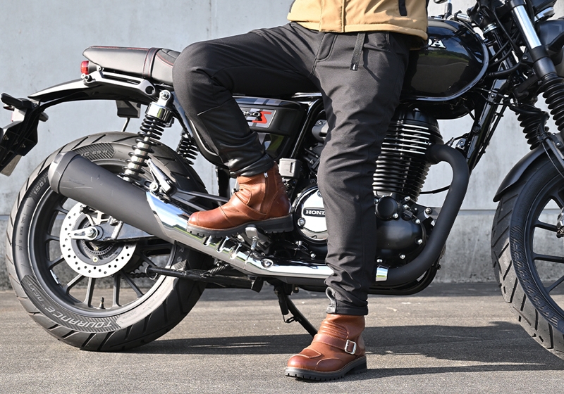 ストレート形状でバイクを下りた後も違和感が少ないデザイン。ワンタッチ脱着式ベルトを装備。