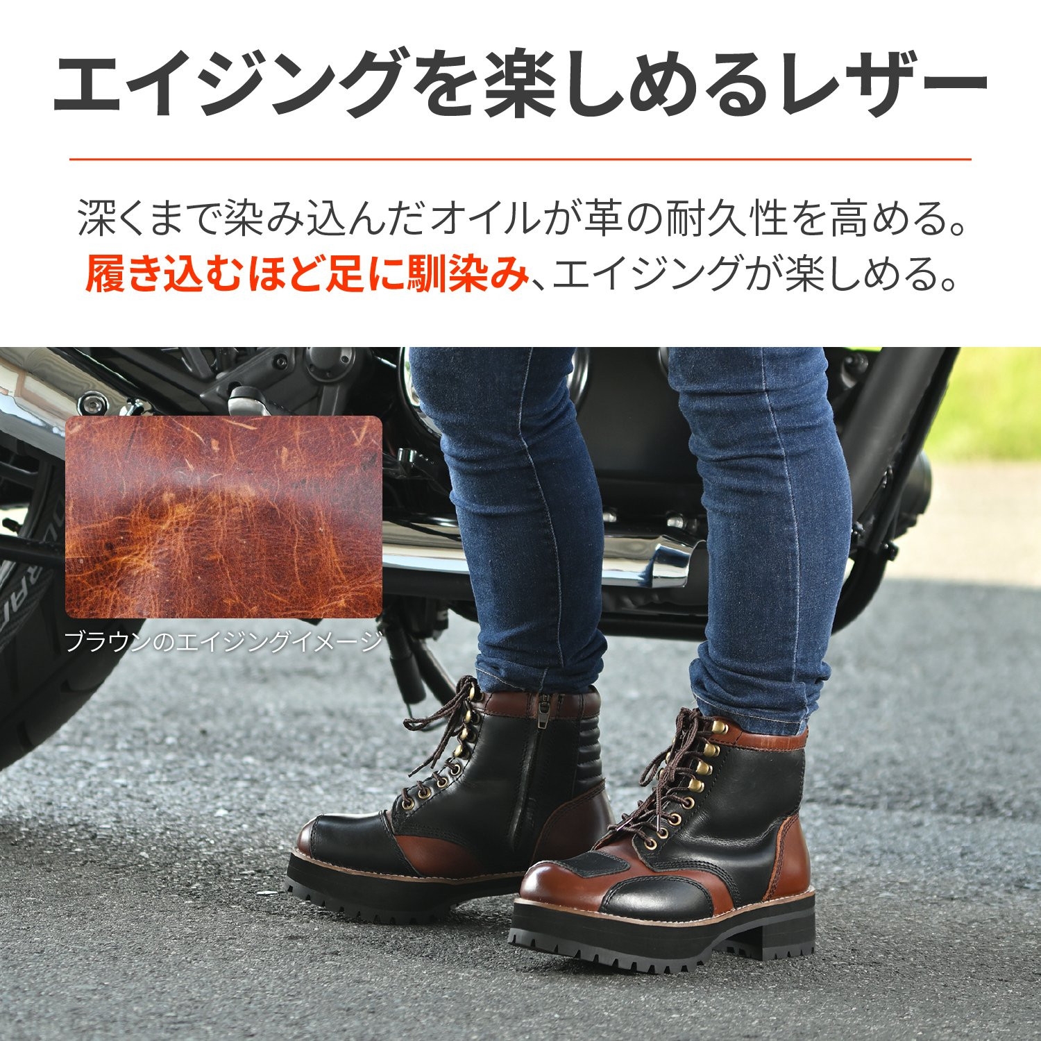 一般的なものより多くのオイルを染み込ませた牛革で、履き込むほどに馴染んでエイジングが楽しめます。