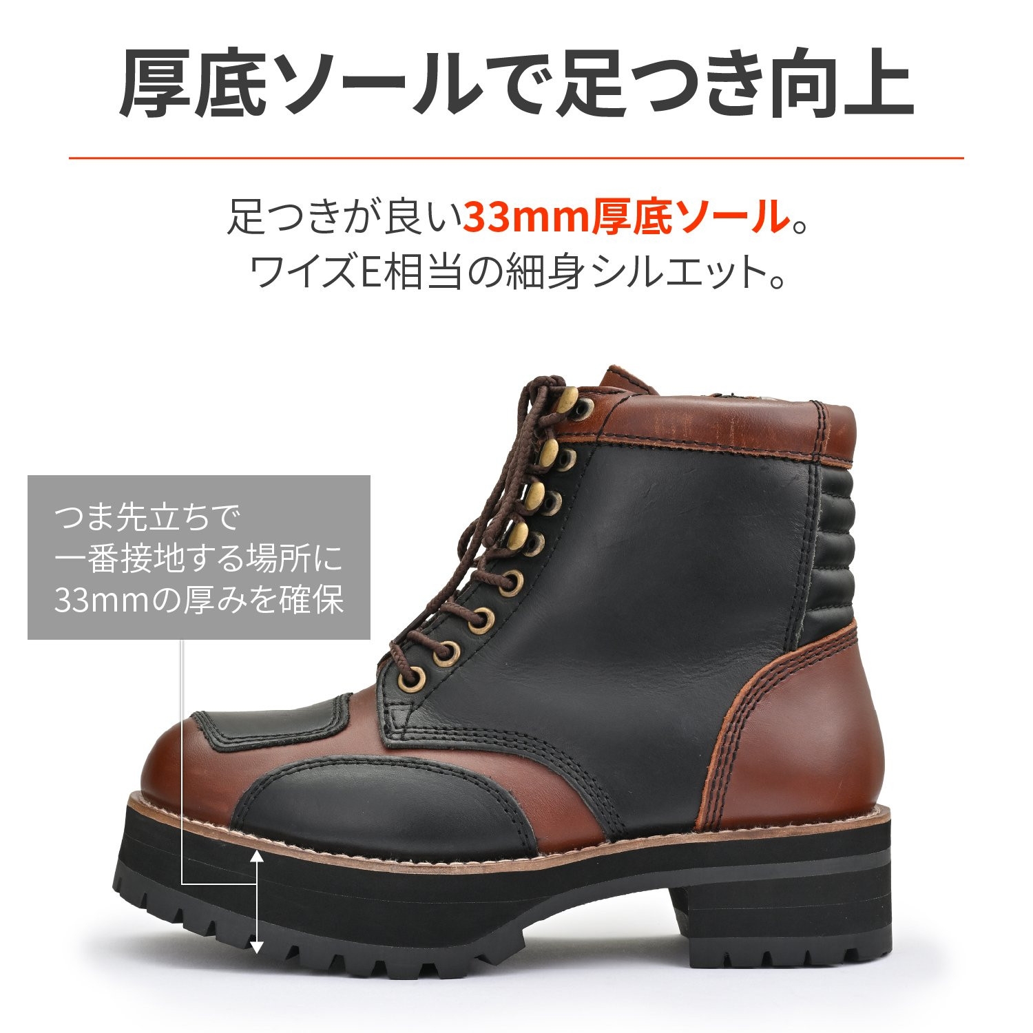 ワイズE相当の細身シルエットに33mmの厚底ソールで足つき性を向上。