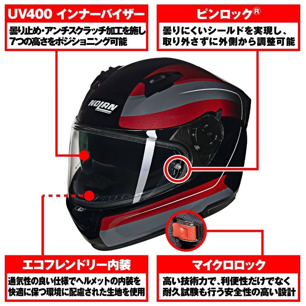 広い視界や優れたベンチレーションシステム、取り外して洗える内装パッドやインナーバイザーなどで着用時も快適に。