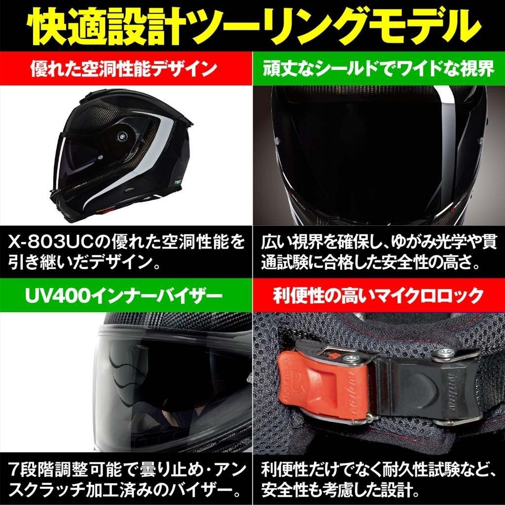 レプリカヘルメットのX-803UCの優れた風洞性能を引き継ぎつつ、ツーリングユースにマッチした快適設計モデル。