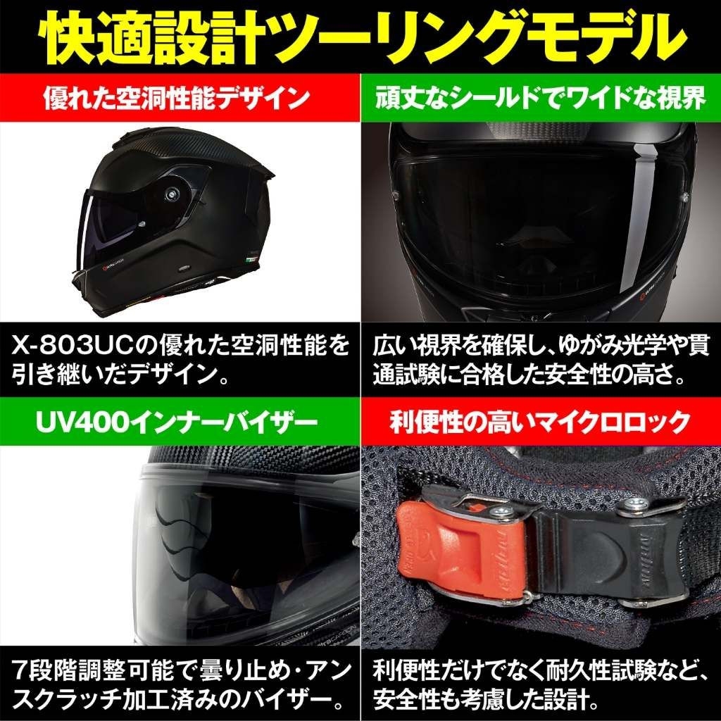 レプリカヘルメットのX-803UCの優れた風洞性能を引き継ぎつつ、ツーリングユースにマッチした快適設計モデル。