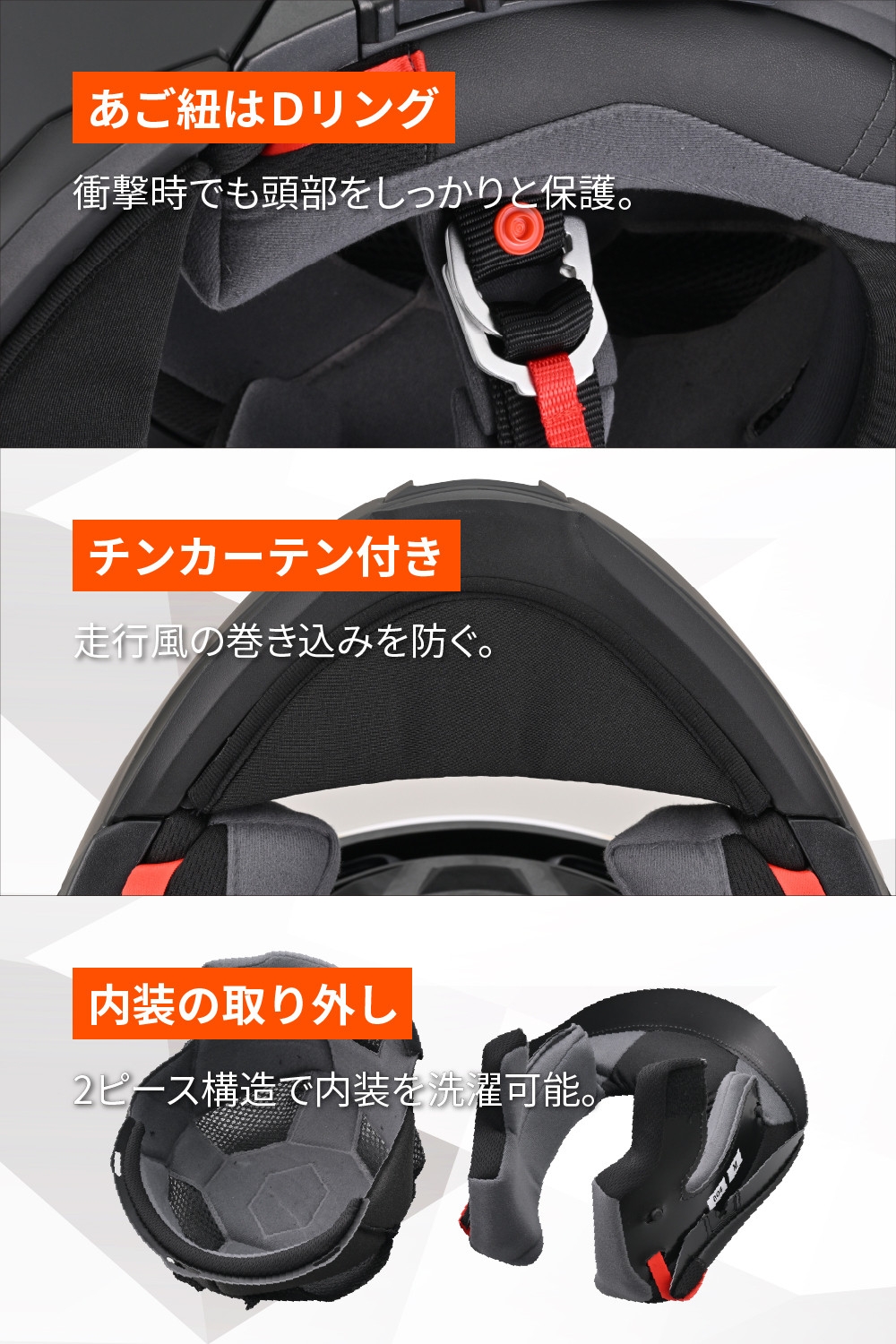 ●フリップアップ機能:チンガードのロックを解除することでジェット形状に。チンガードが下がらないロック付。