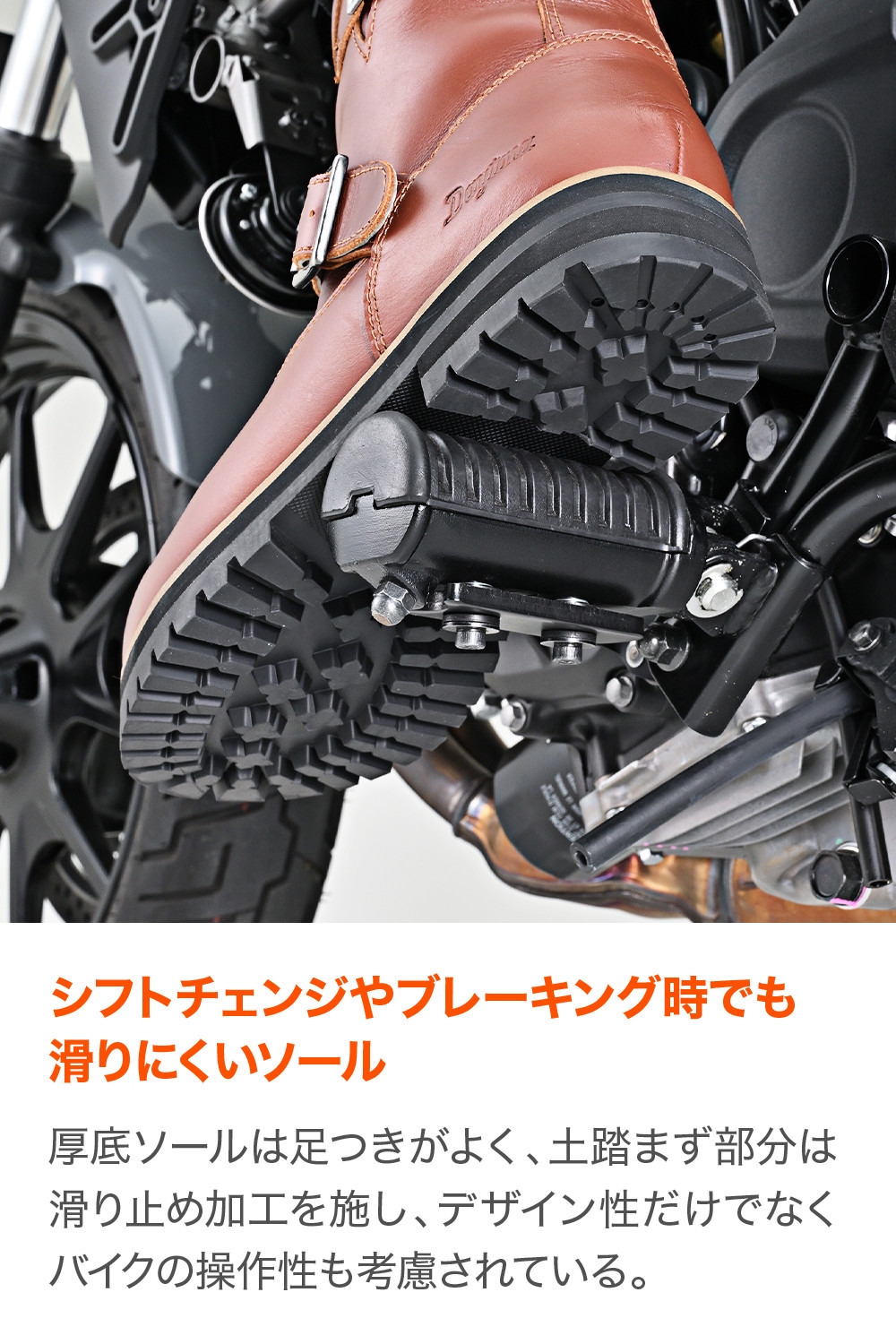 シフトチェンジやブレーキング時でも滑りにくいソールは、厚めになっているので足つき性も抜群。