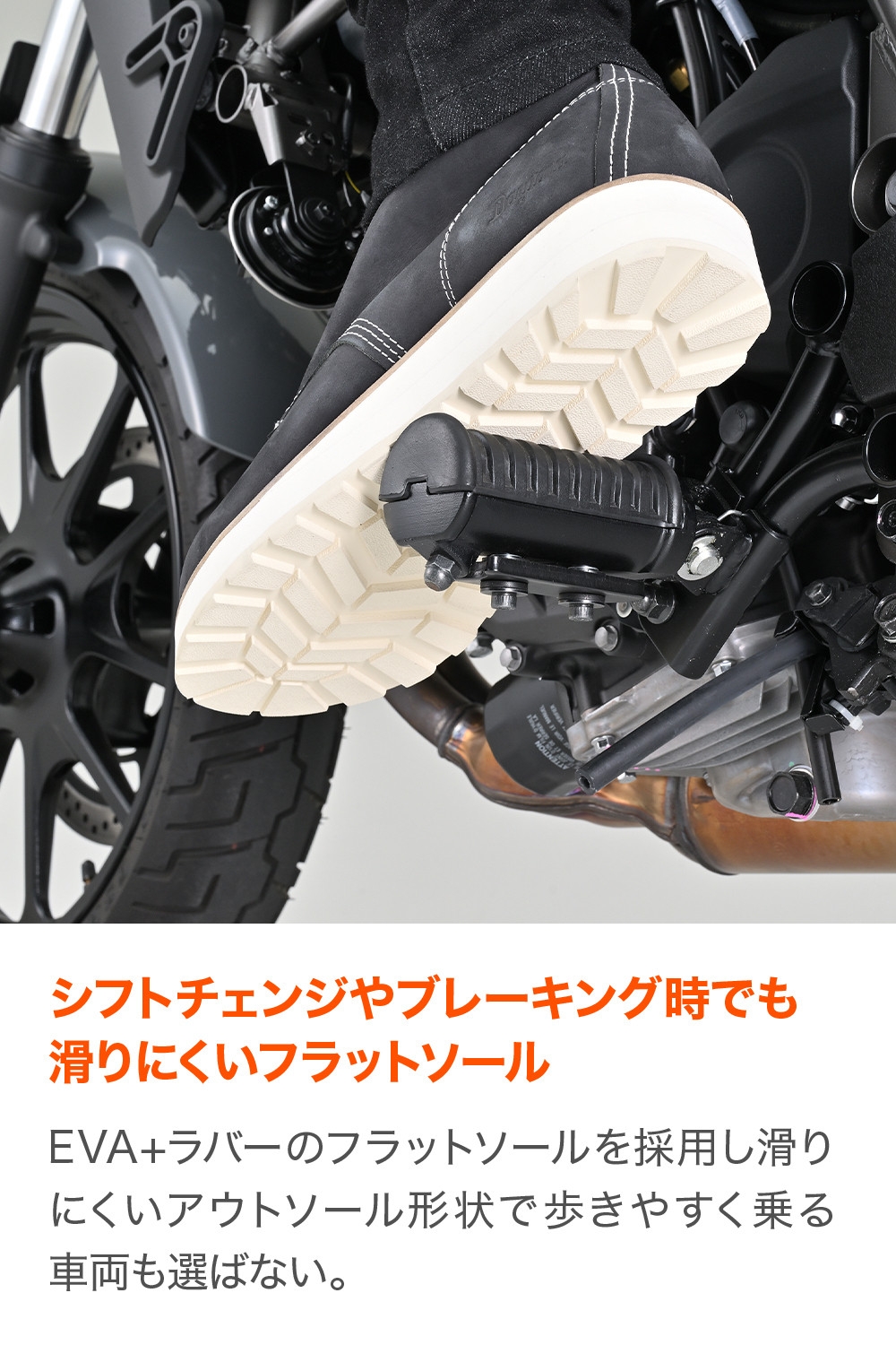 ソールにはEVA+ラバーのフラットソールを採用し、滑りにくく、車種を問わず扱いやすい設計に。