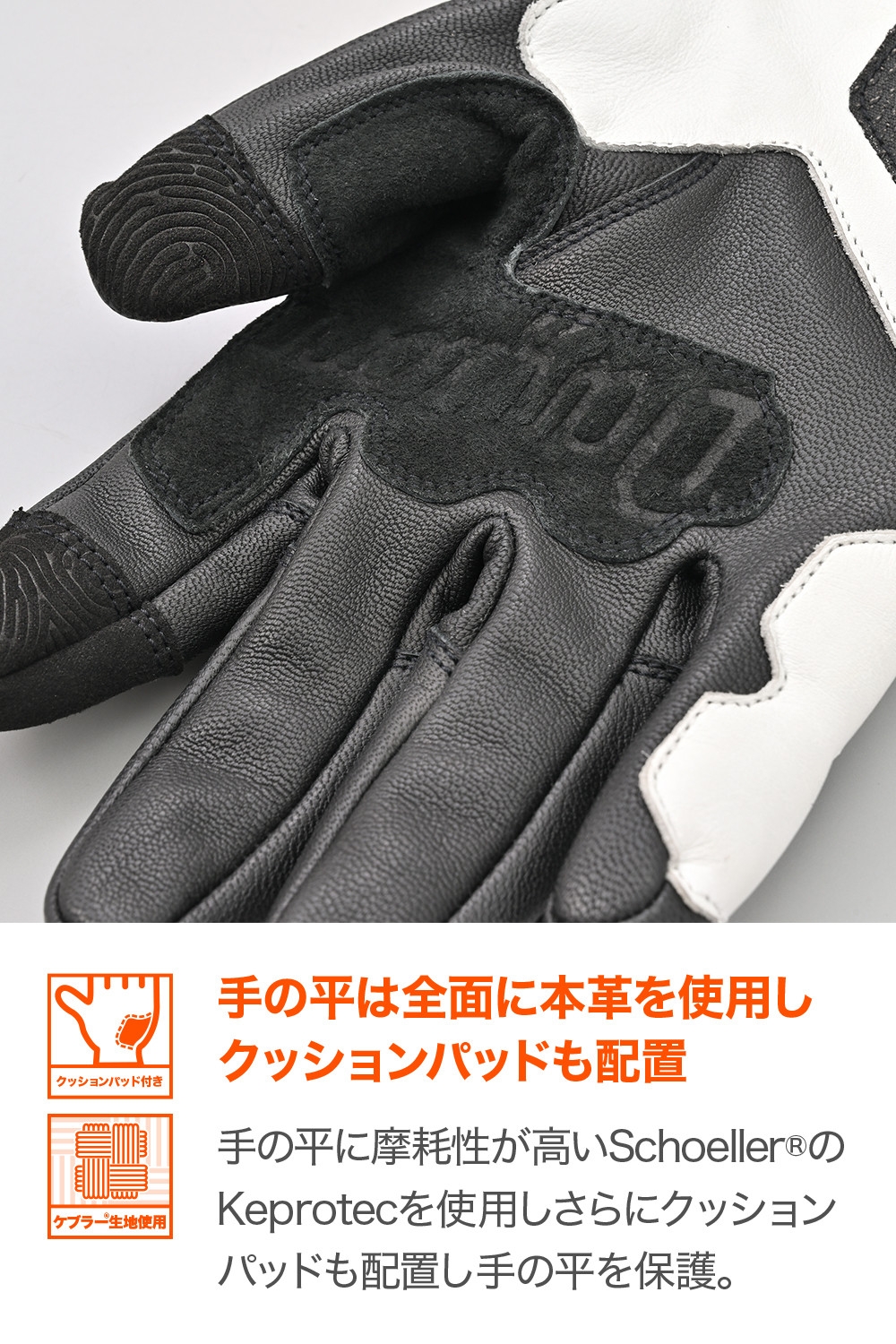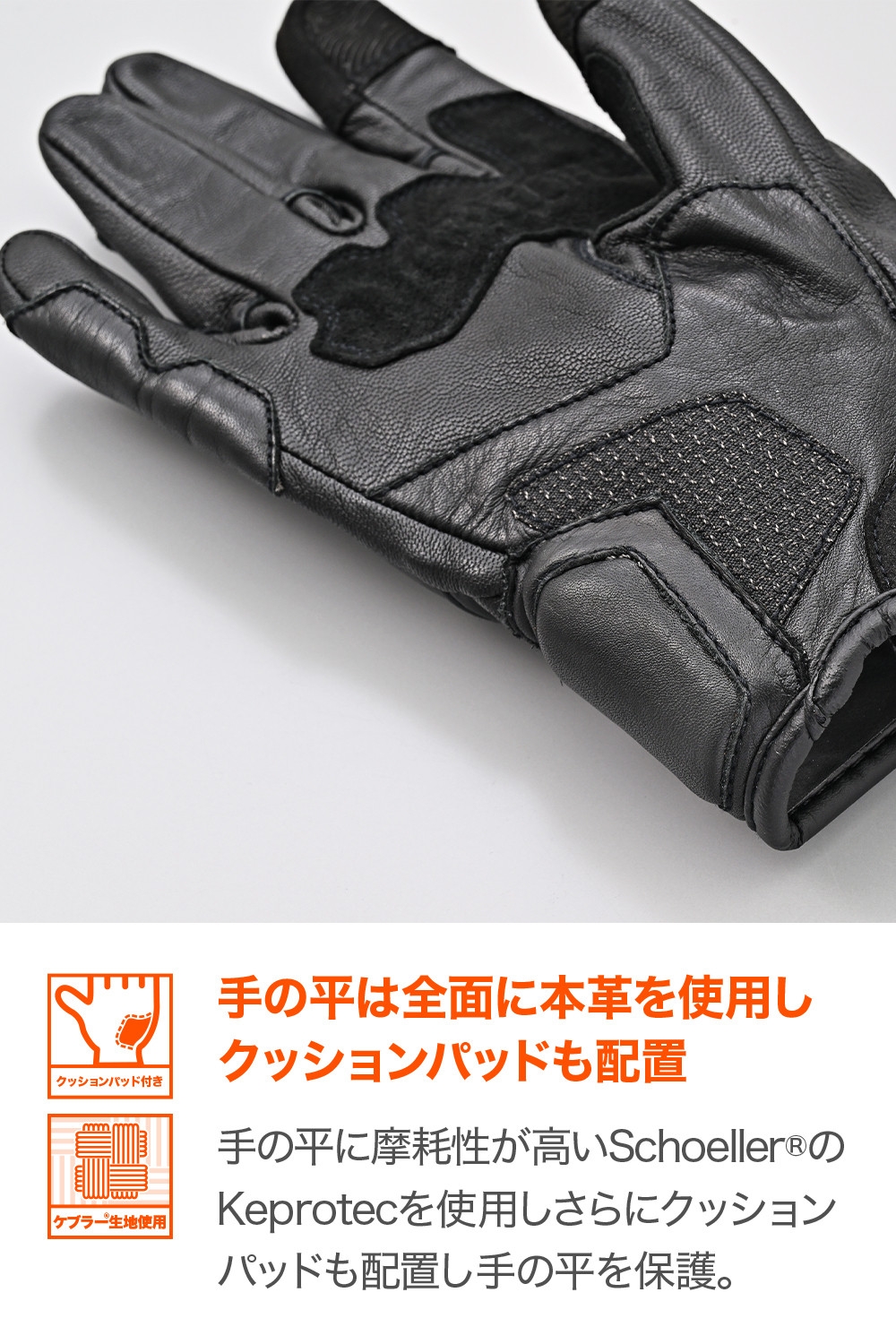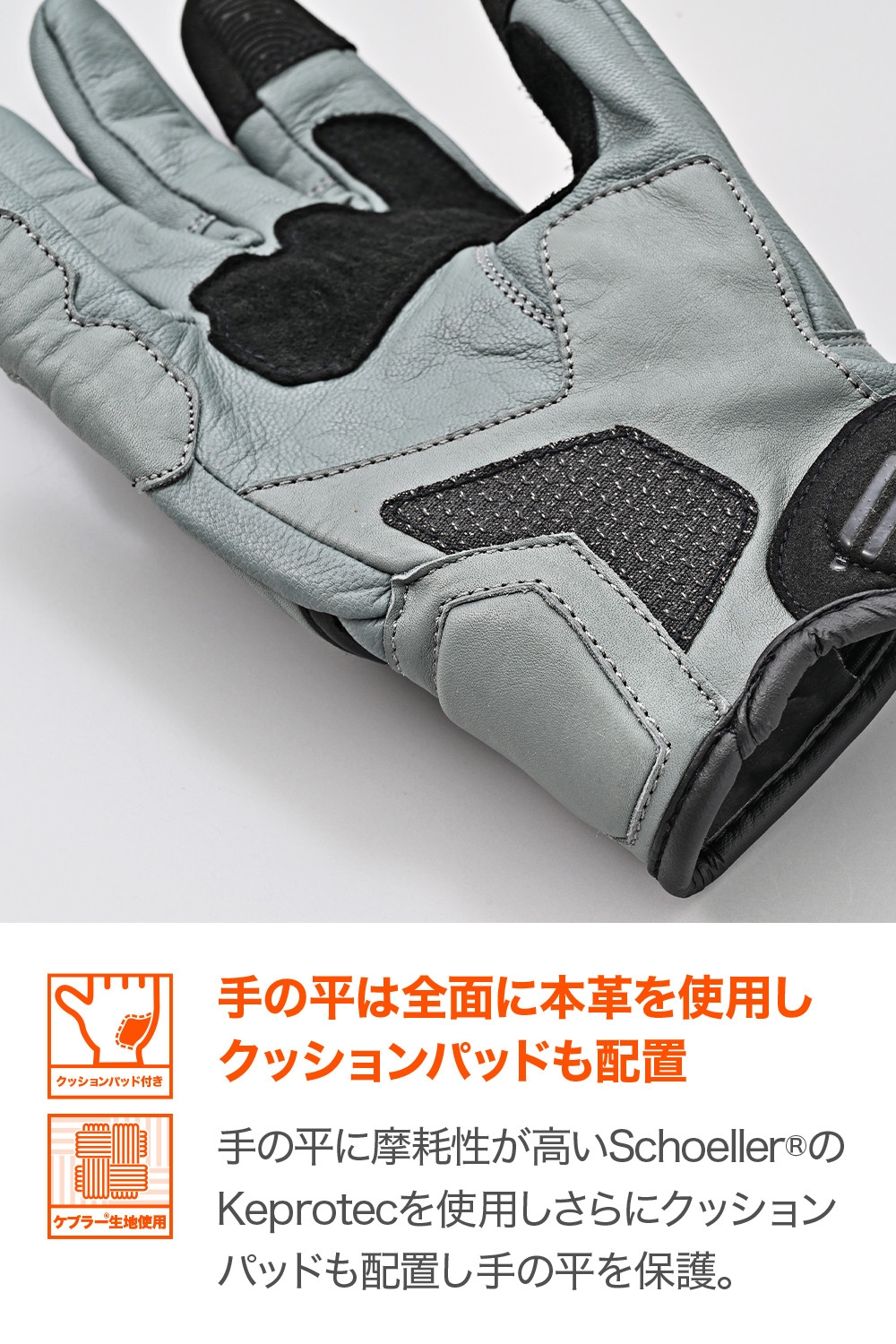 手の平には耐摩耗性に優れるSchoeller?Keprotecを使用し、クッションパッドと組み合わせることで、高い操作性と安全性、耐久性を両立しました。