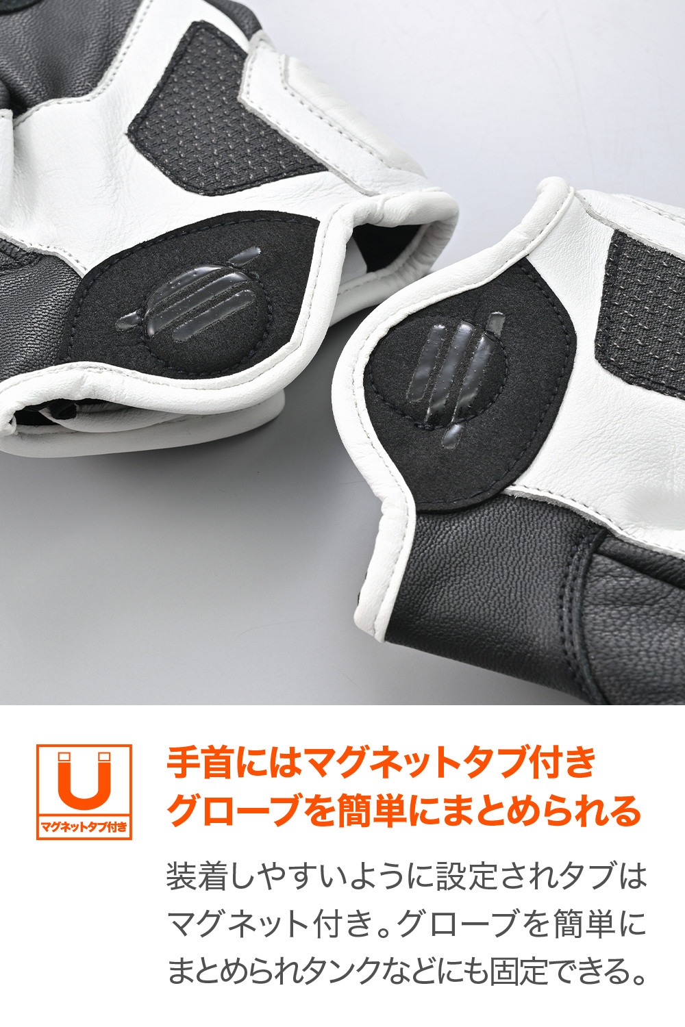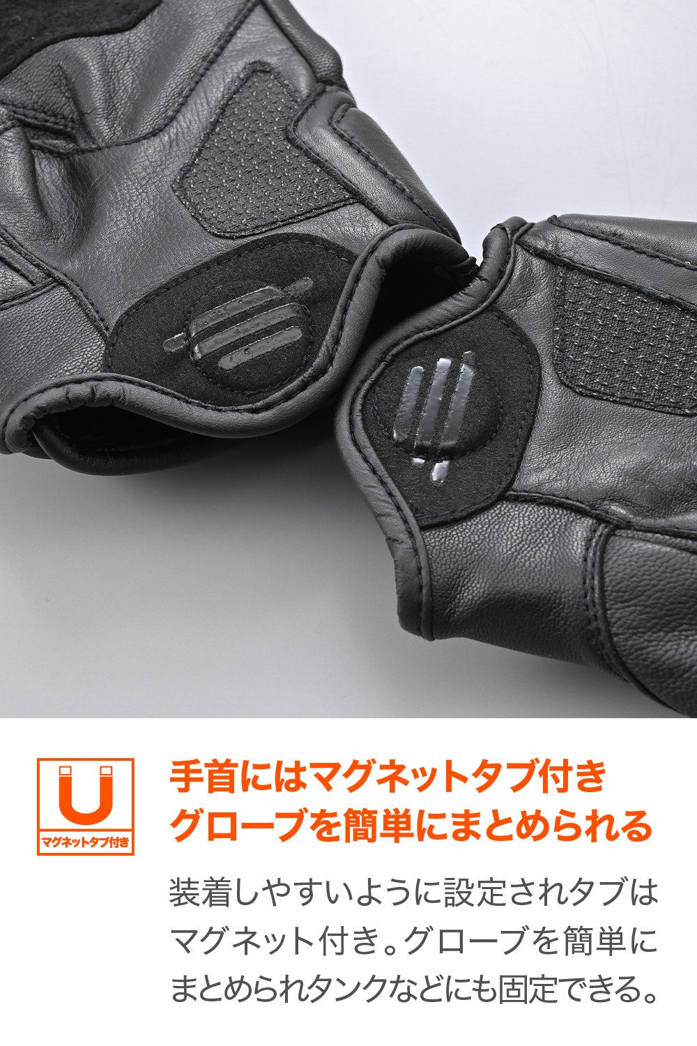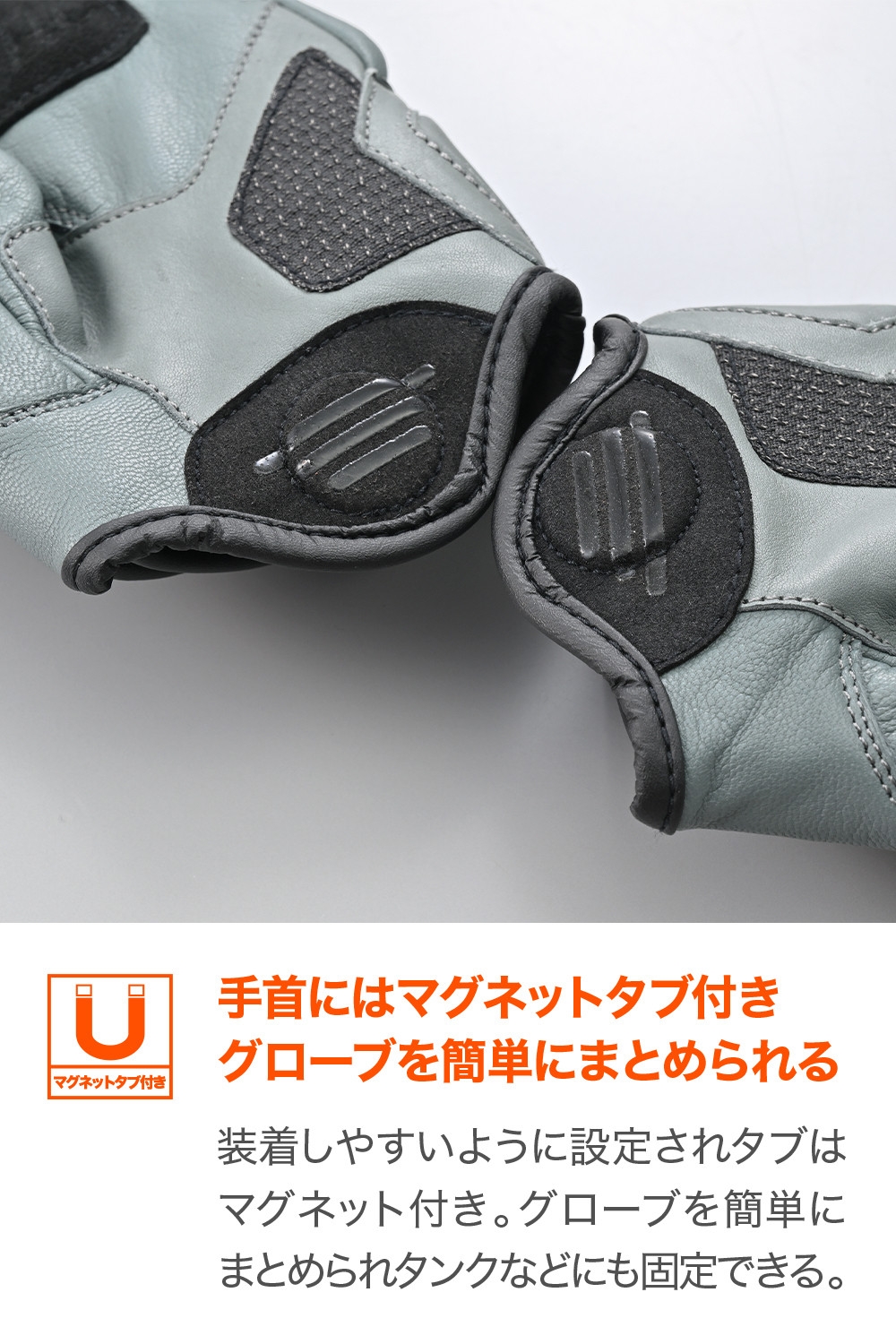 手首にはマグネット入りの引っぱりタブを採用。タンクなどに固定でき、左右のグローブをまとめて保管可能。