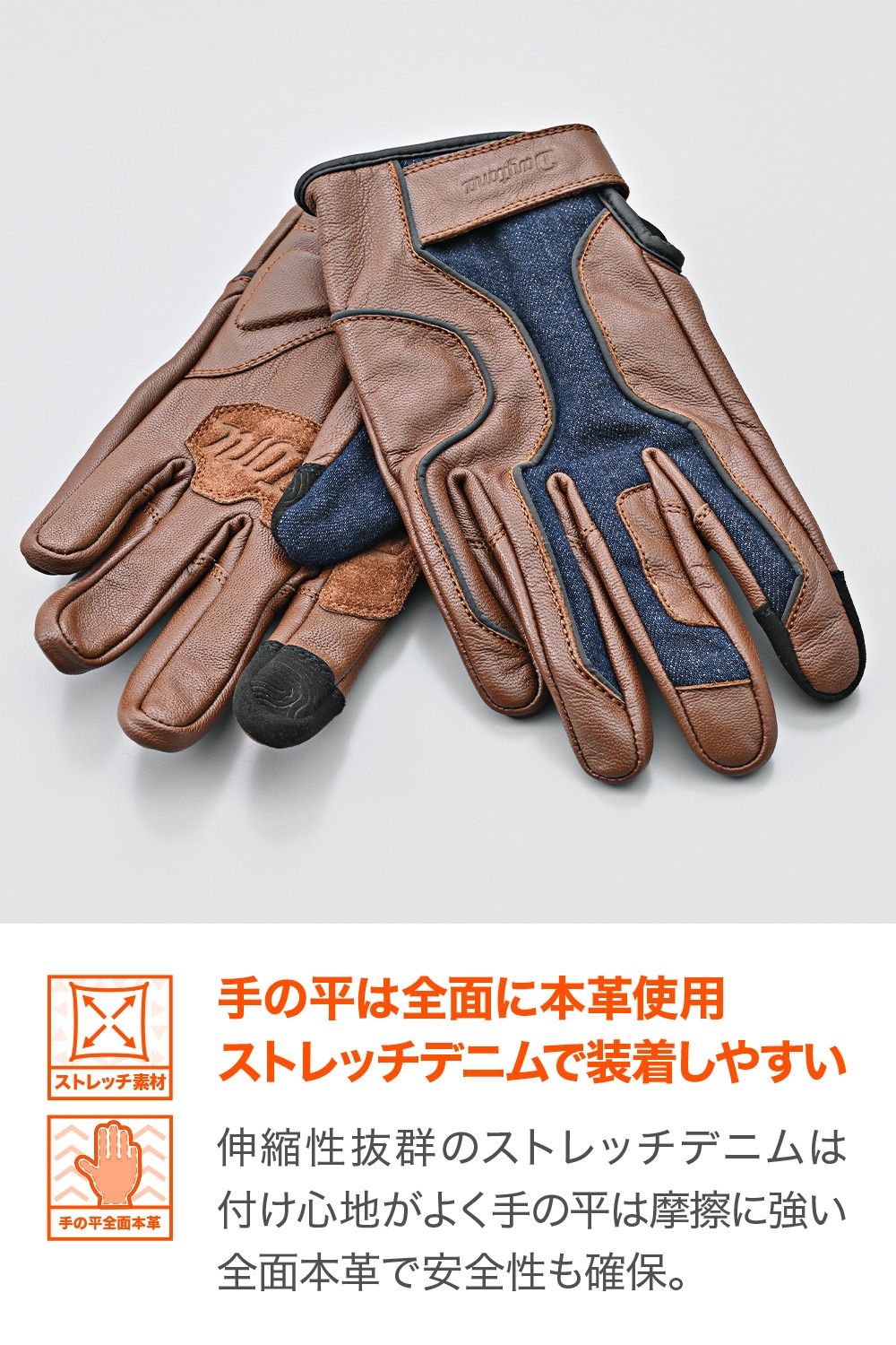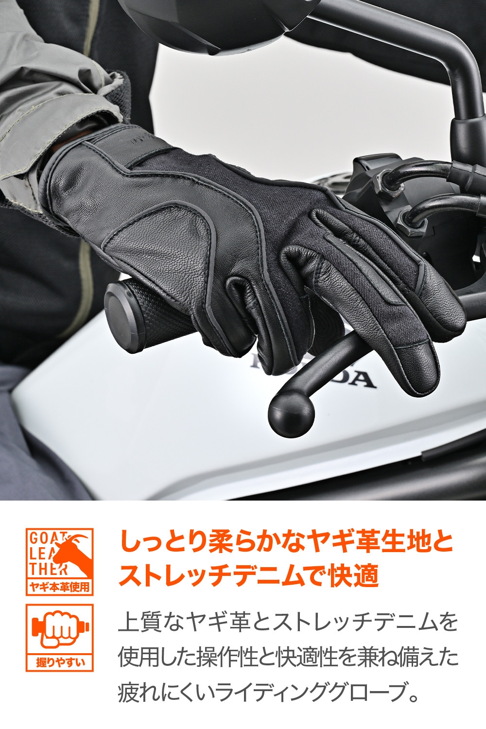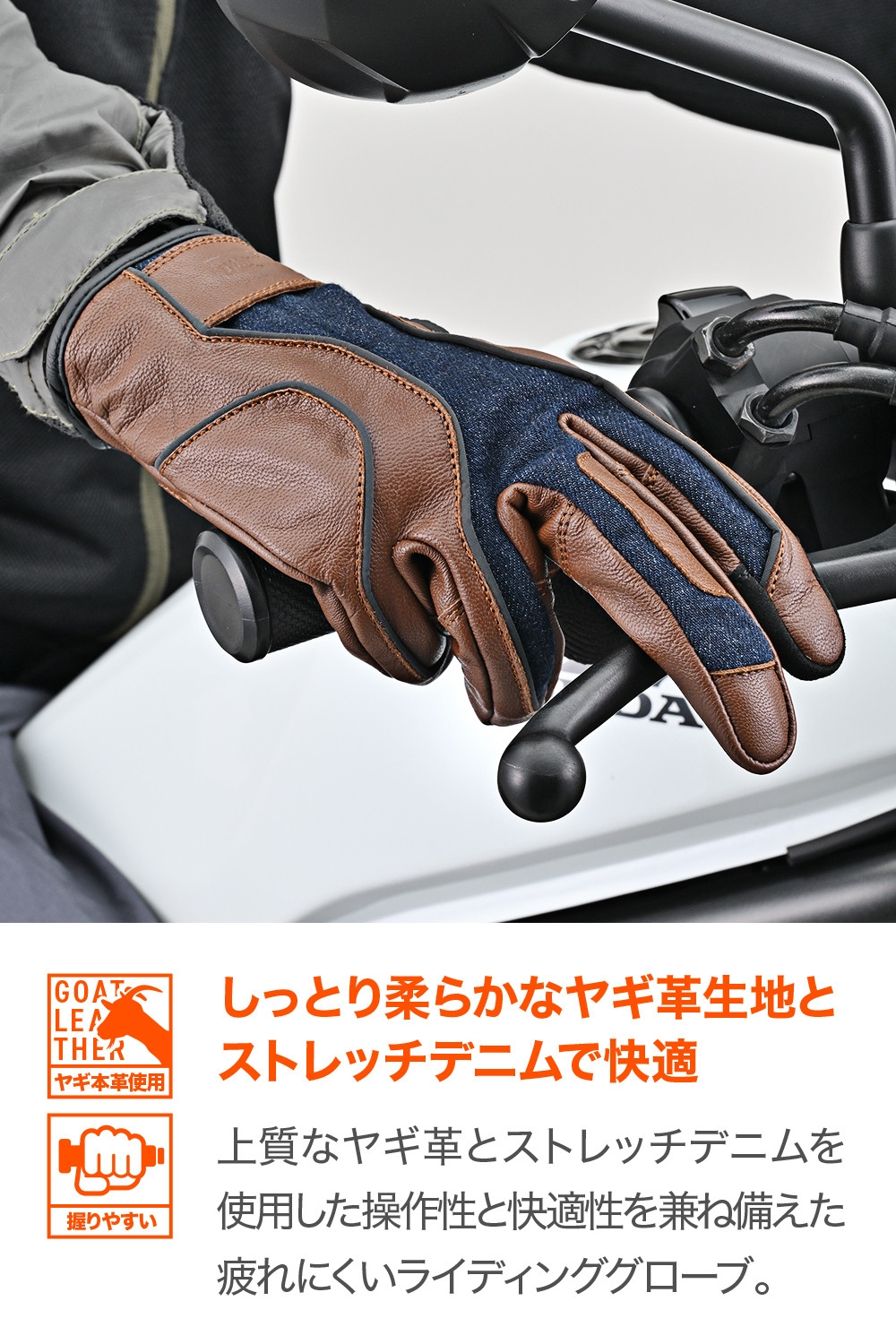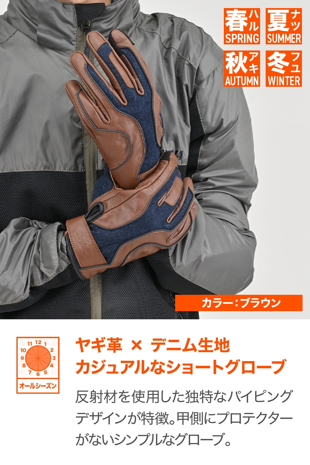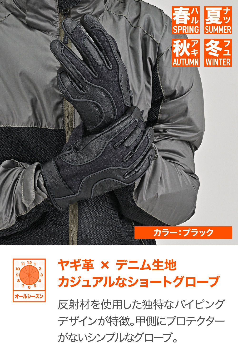 しなやかなやぎ革とストレッチデニムを組み合わせたカジュアルショートグローブ。