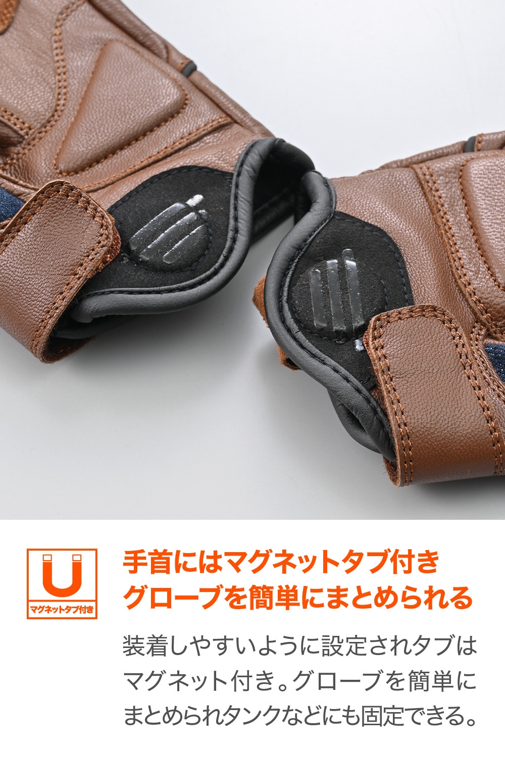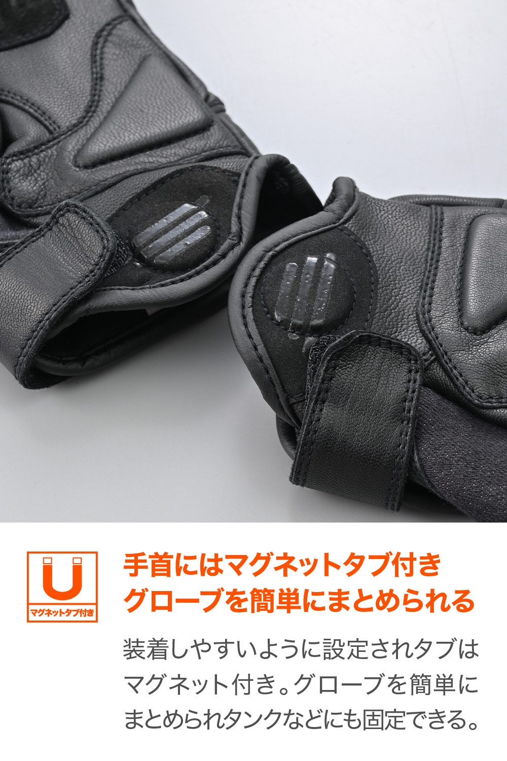 手首にはマグネット入りの引っぱりタブを採用。タンクなどに固定でき、左右のグローブをまとめて保管可能。