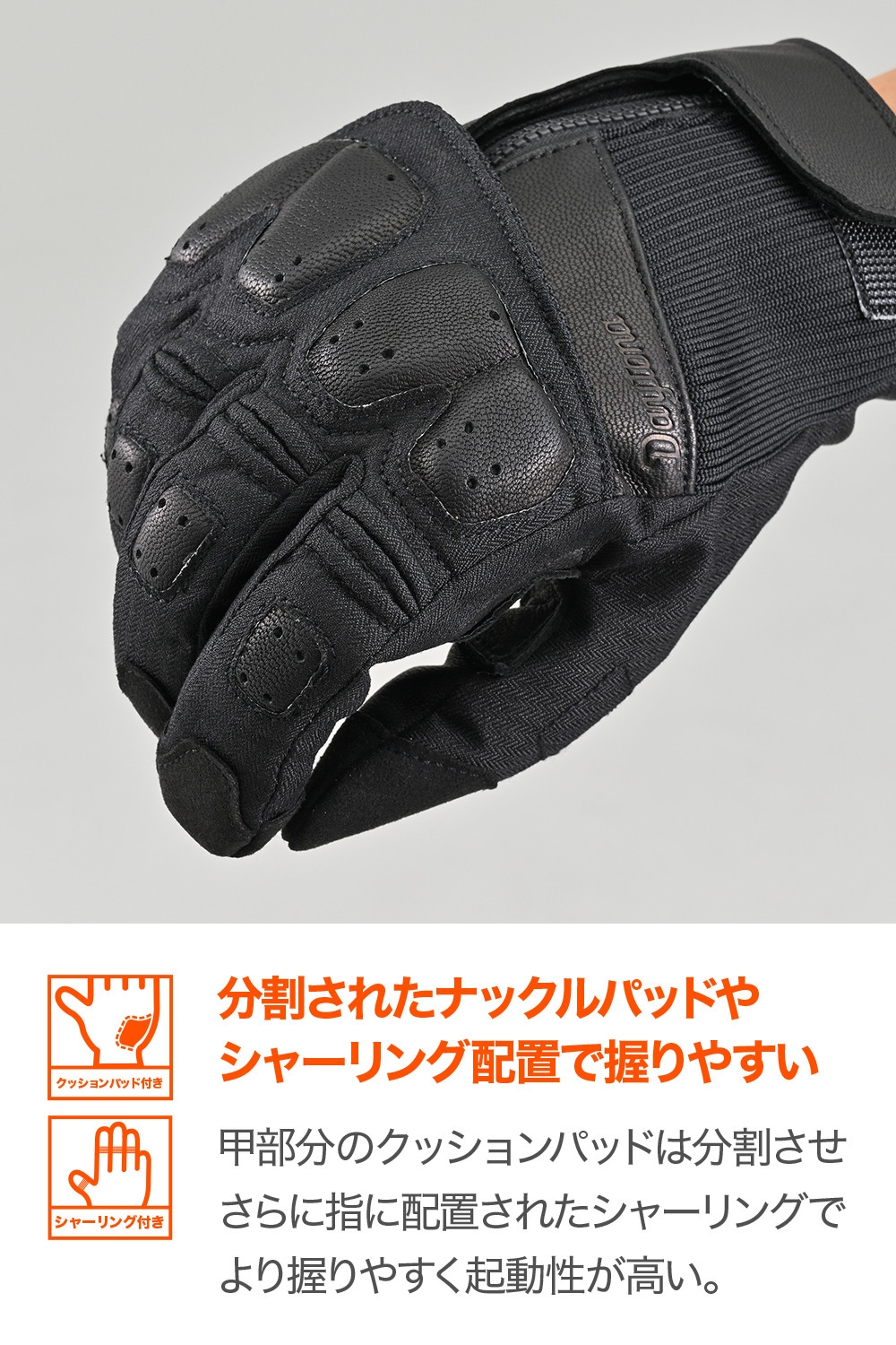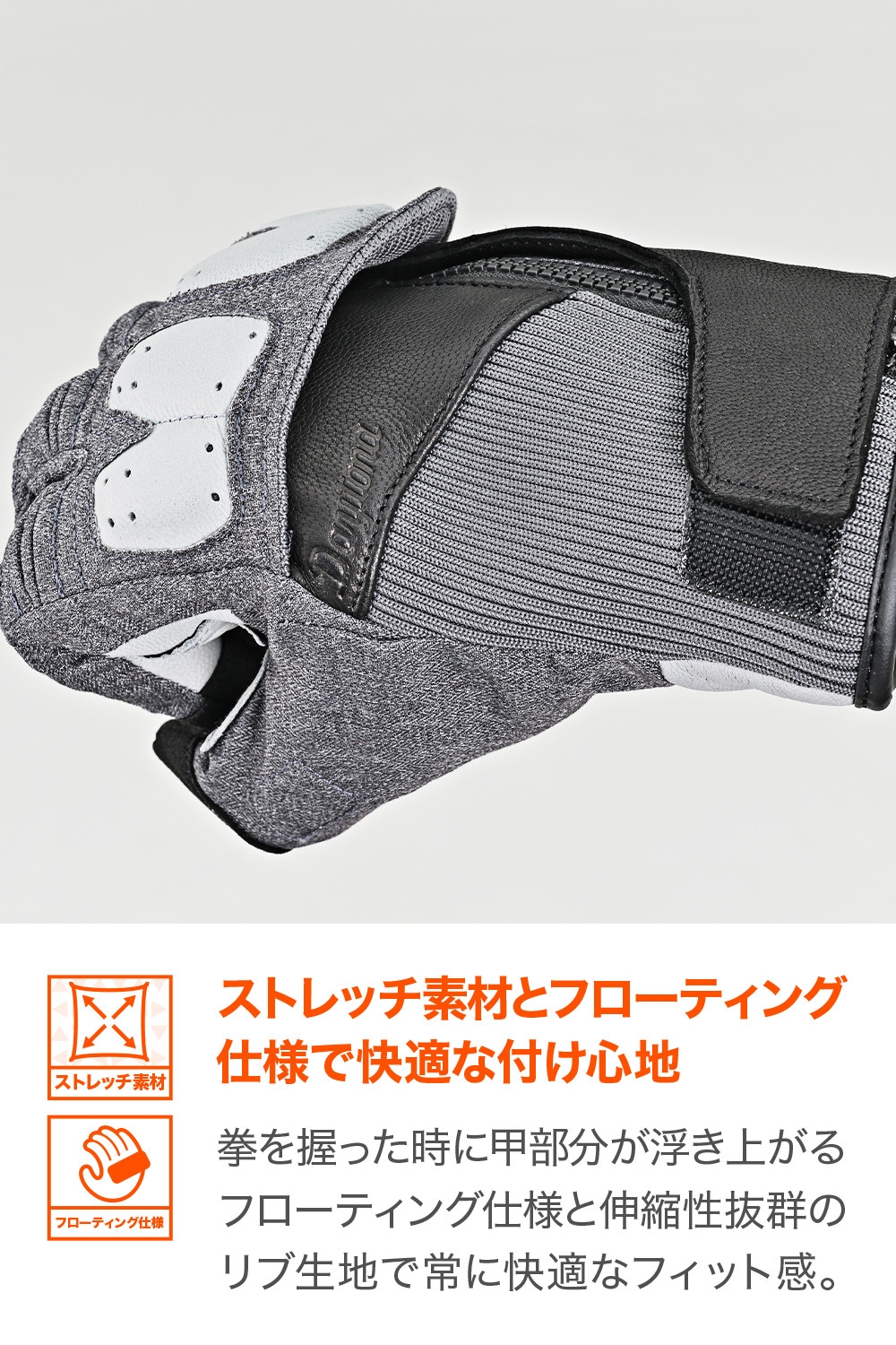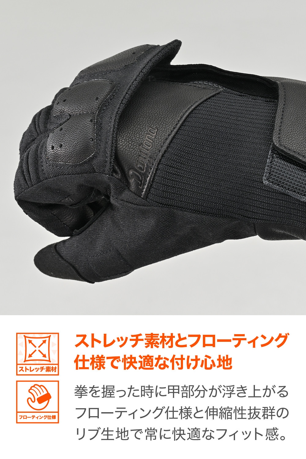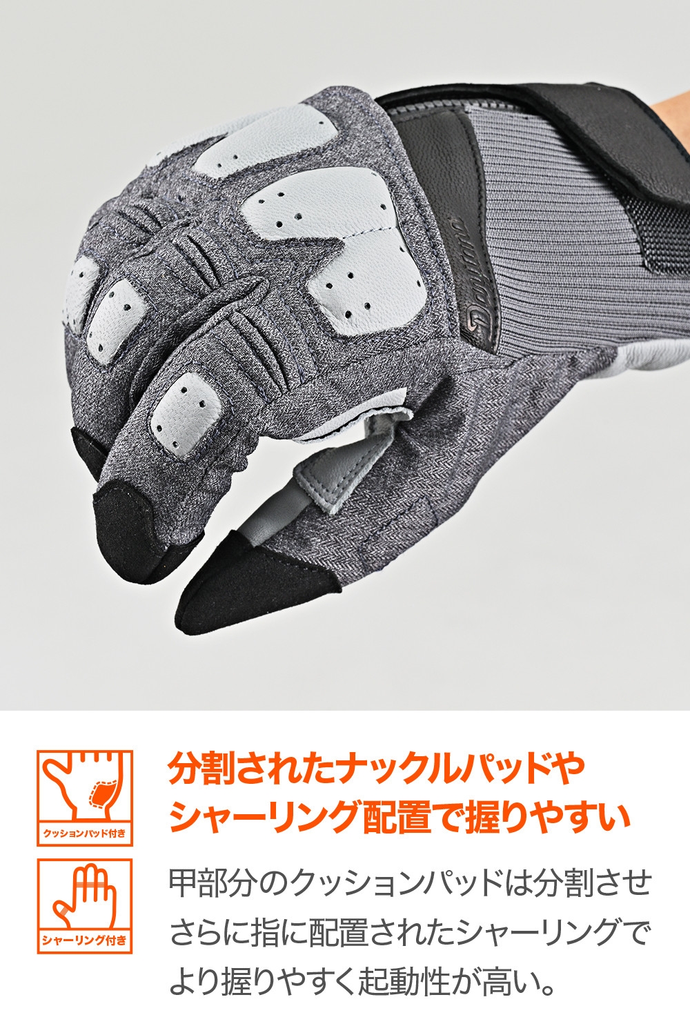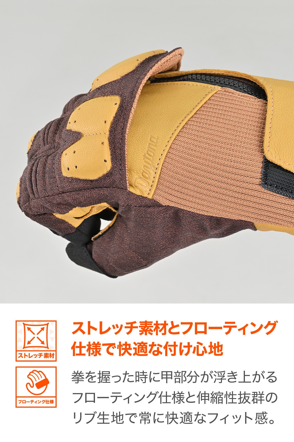 シャーリングやストレッチ素材、フローティング構造により、手にフィットしつつ動かしやすい設計です。