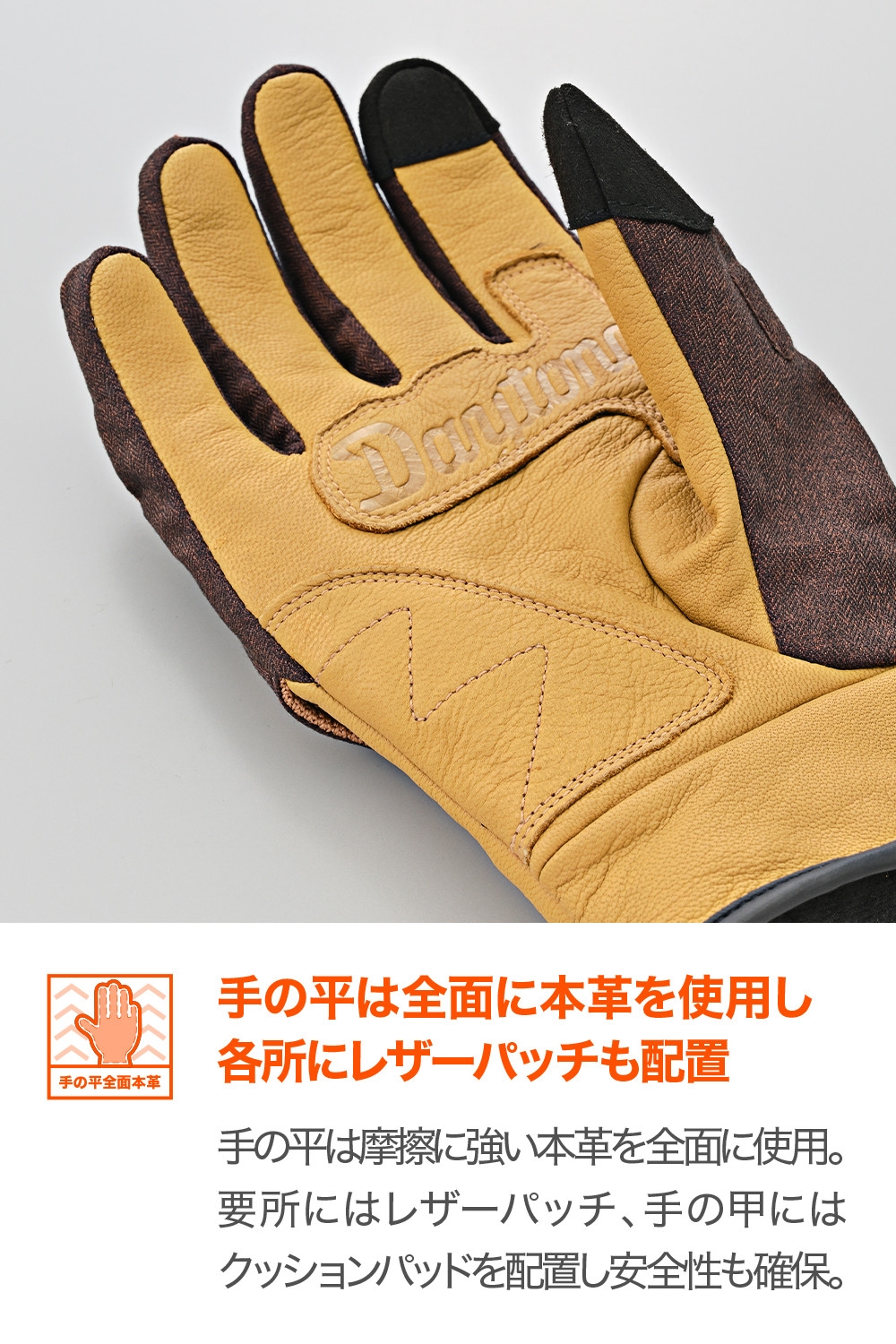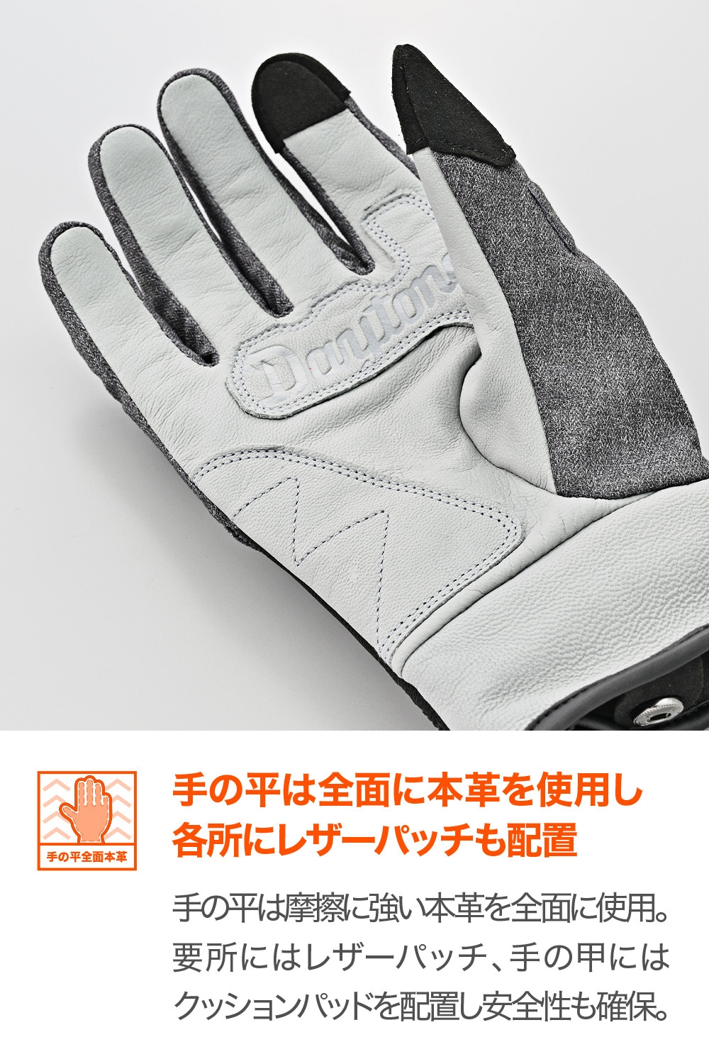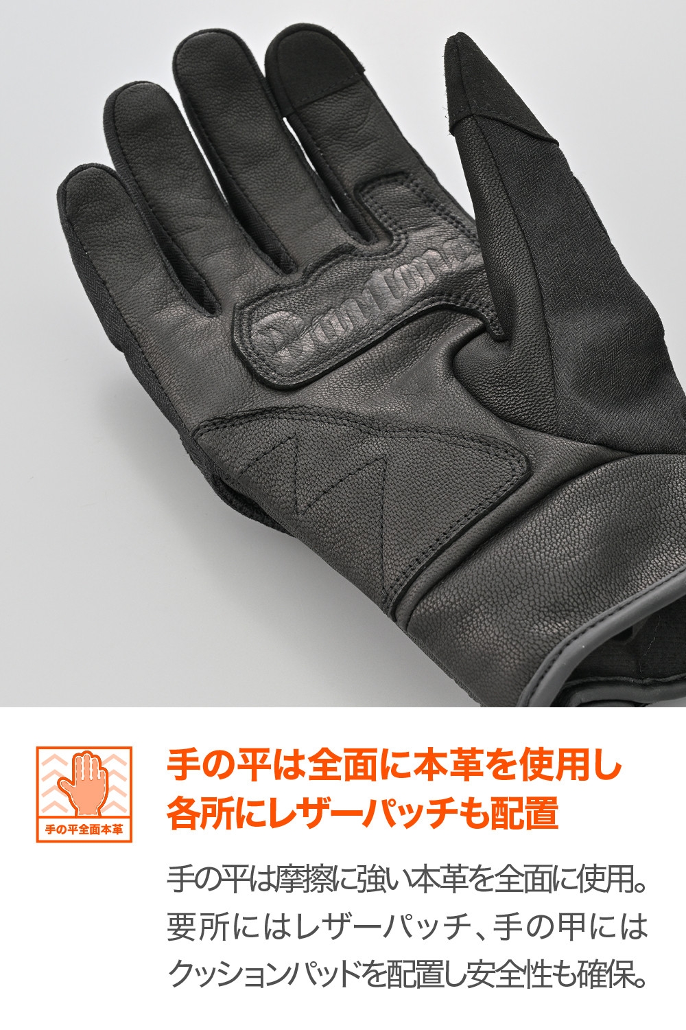 手の平は全て本革で、各所にレザーパッドを配置して手をしっかり保護します。