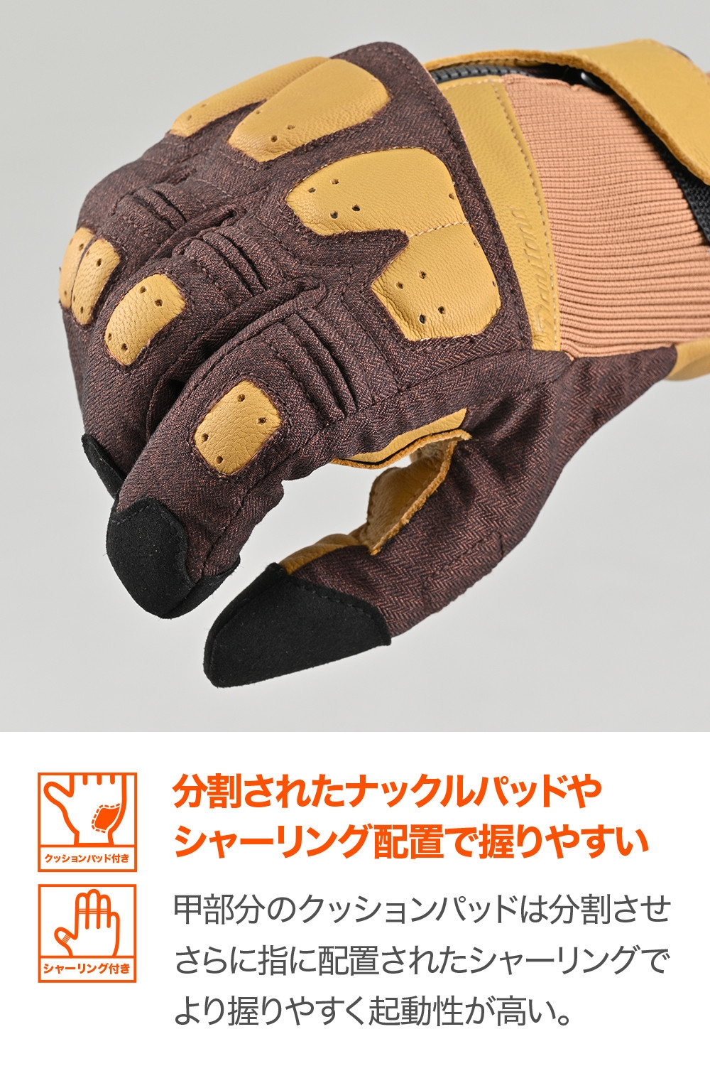 甲側にはリブを採用し、ナックルプロテクターを分割することで手の動きを妨げず、自然な握りやすさを確保。