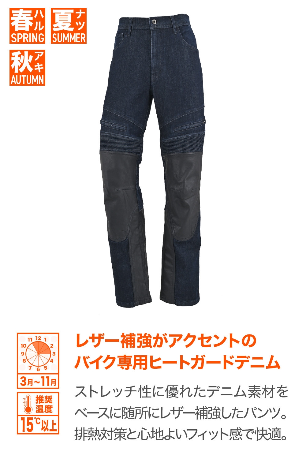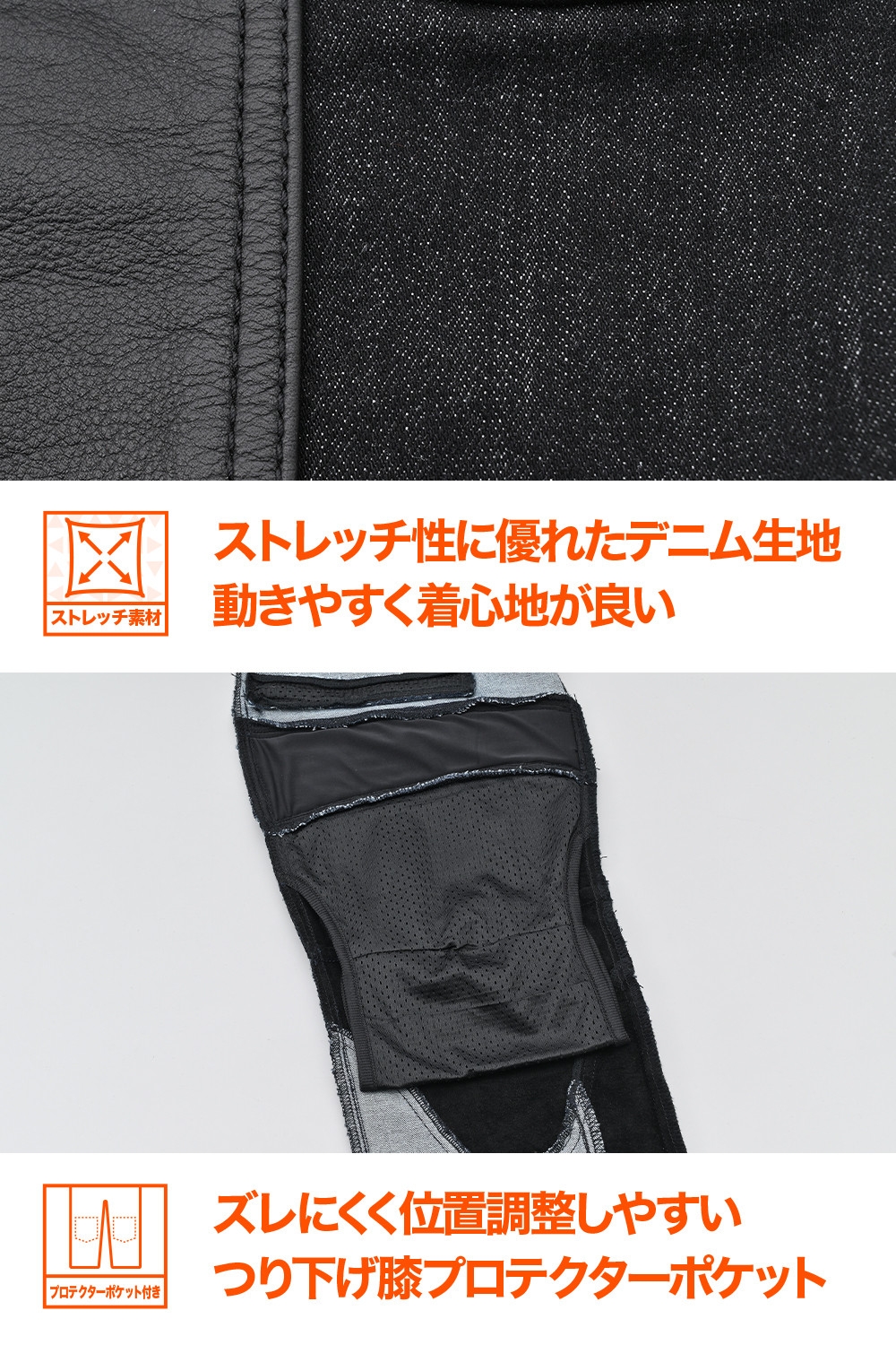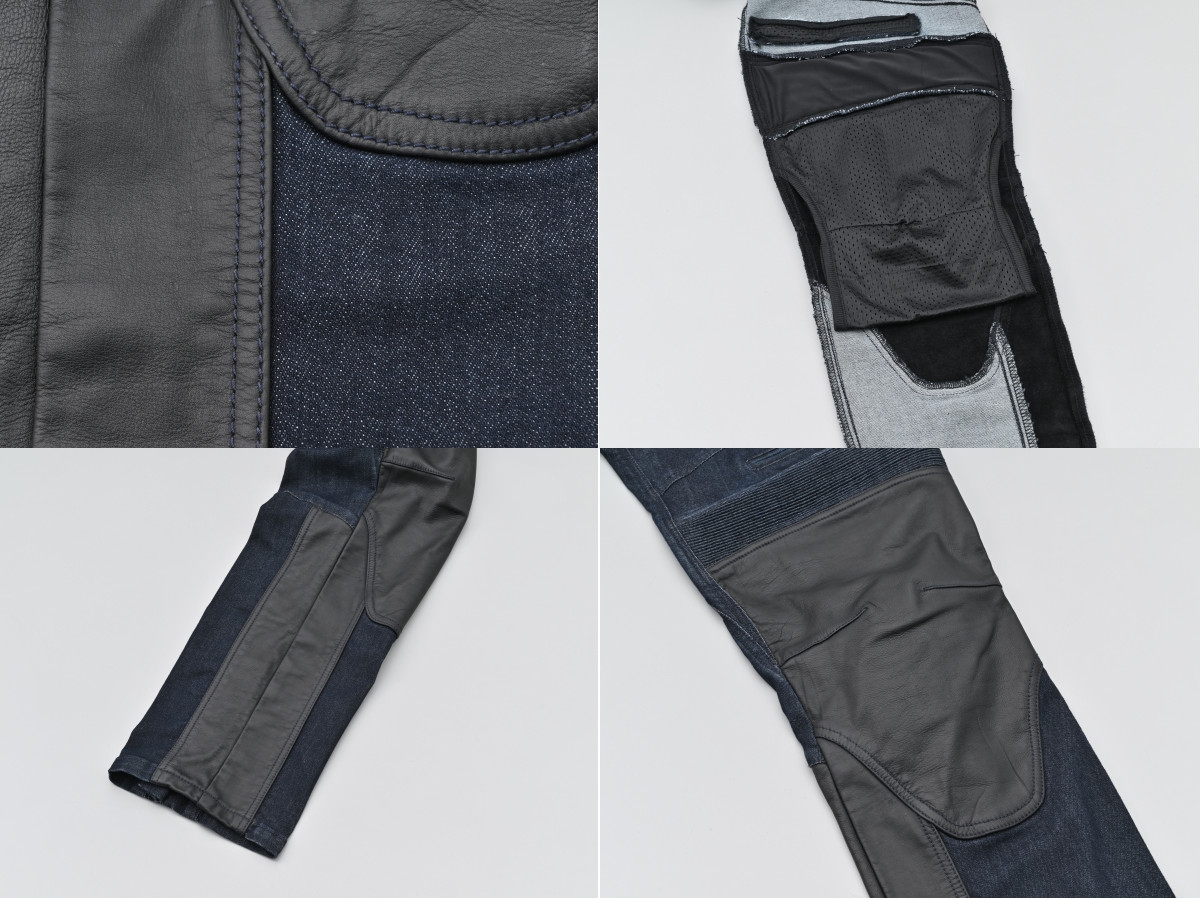 ストレッチ性に優れたデニム素材をベースに、負荷のかかる部分にはレザー補強を施し、耐久性と保護力をしっかり確保しています。