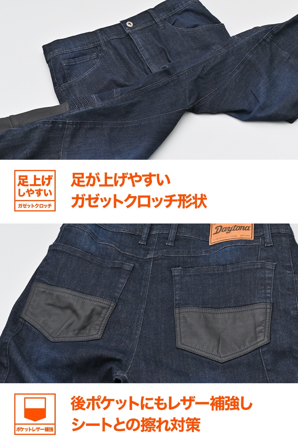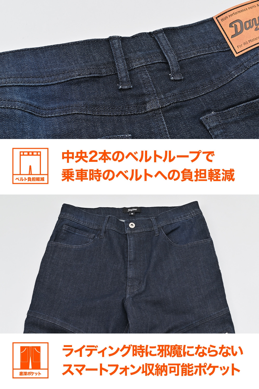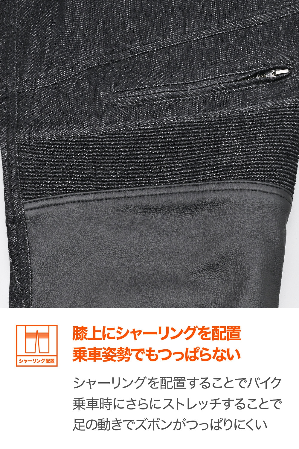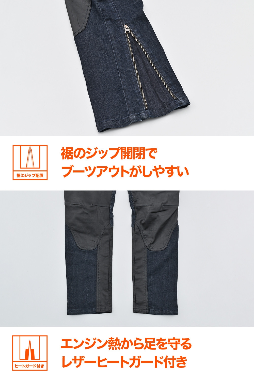 ライディングの動きを妨げず、走行中の操作性を高めるバイク専用デニムです。