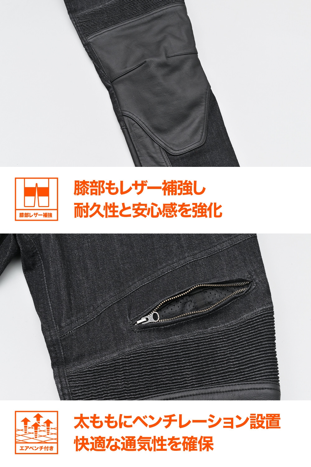 後ろポケット下部や膝部分にもレザー補強を施し、シートとの擦れや摩耗を防止。耐久性と保護力をさらに高めています。