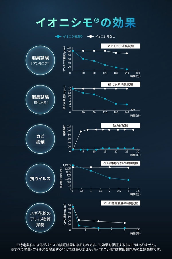 村田製作所の開発したイオニシモ?を採用。プラズマ放電によりイオンとラジカル活性種を放出し、カビ菌・アレル物質を酸化分解。