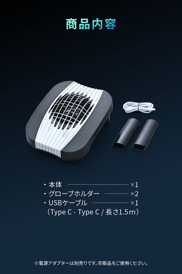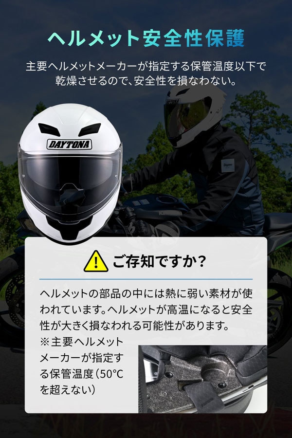 主な機能:大風量&大開口 / プラズマイオン消臭 / 各種ヘルメット対応 / グローブ・フットウエア対応 / モバイルバッテリー給電対応 / オート乾燥・消臭機能 / 風量調整 / タイマー機能