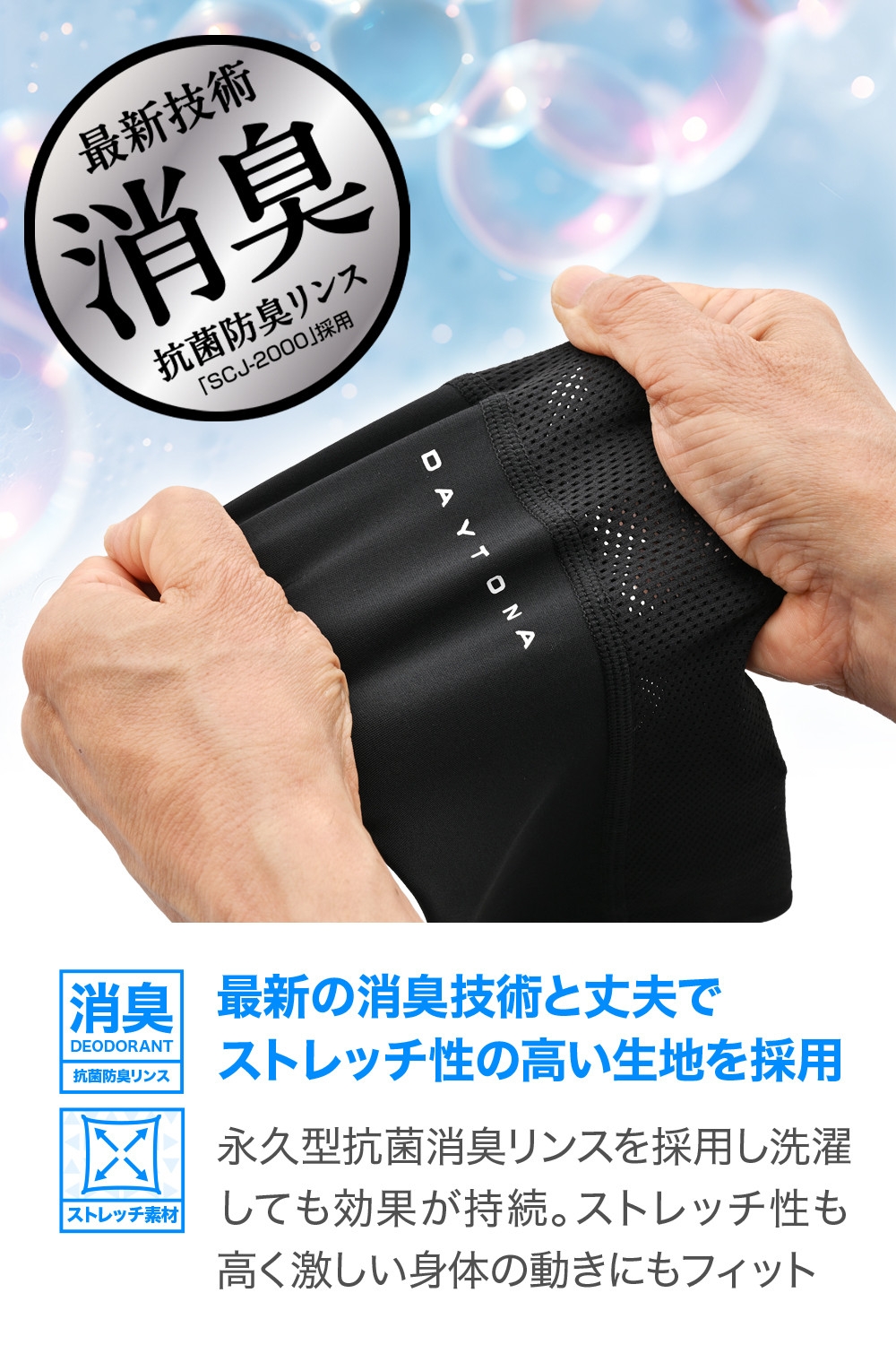 最新の消臭抗菌加工を施しており、汗をかきやすい夏場でも清潔感をキープ。