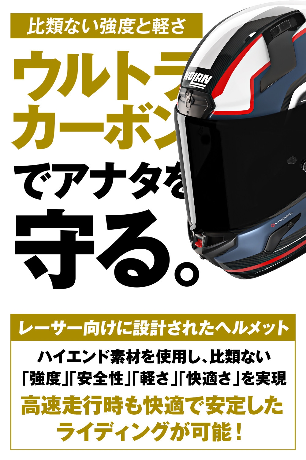 カーボンやアラミド繊維といったハイエンド素材を使用し、比類ない強度、安全性、快適さ、軽さ、そして空気力学はレーサー向けに設計されています。
