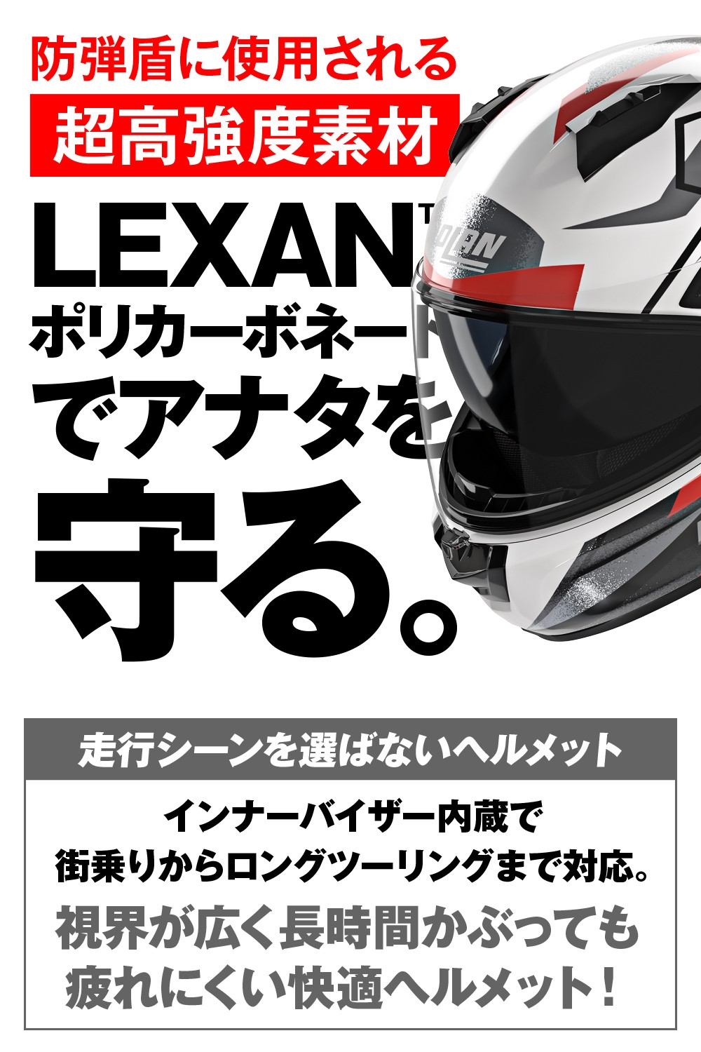 - アウターシェル材質:ハイファンクション/ハイグレードLEXAN™ポリカーボネート