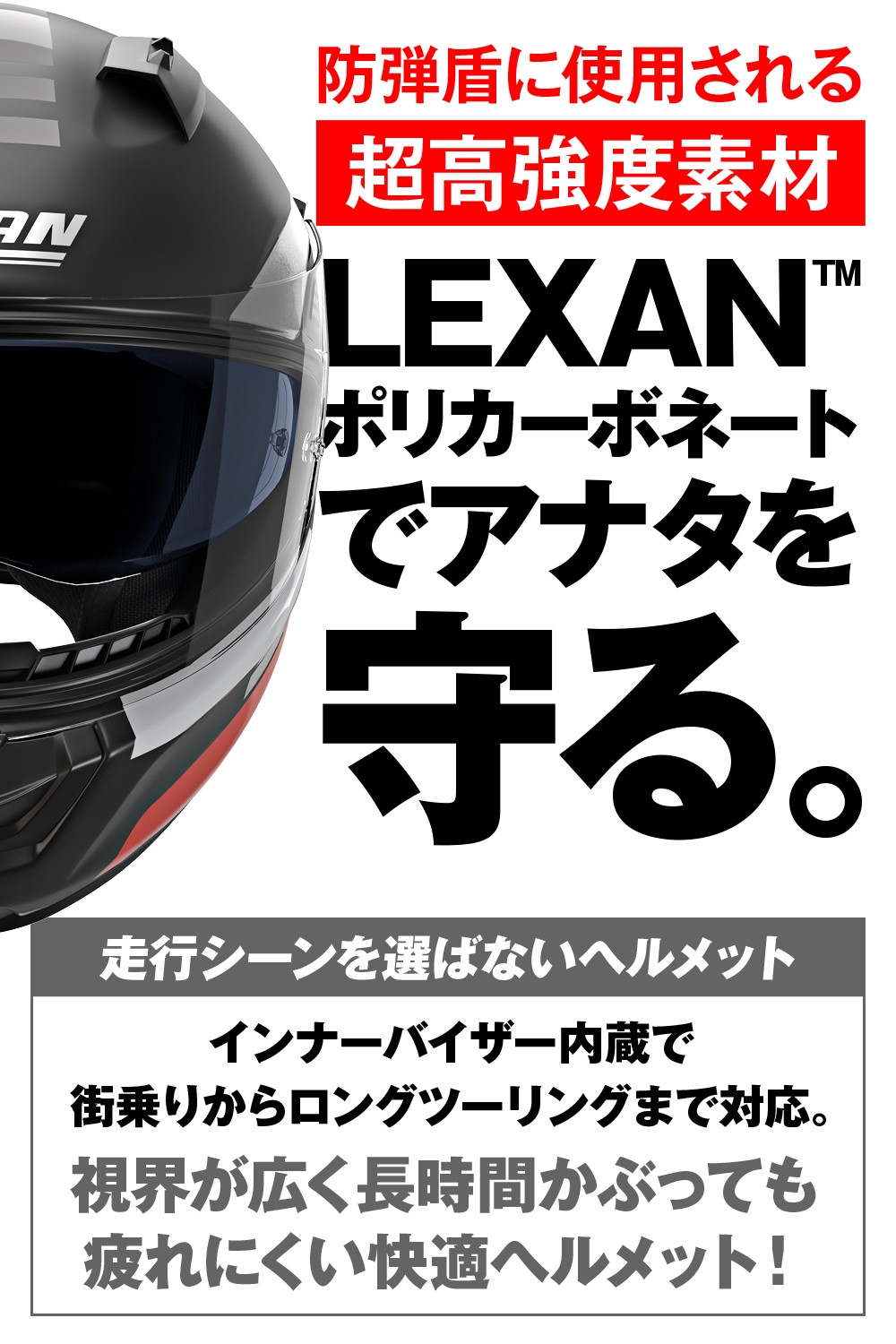 - アウターシェル材質:ハイファンクション/ハイグレードLEXAN™ポリカーボネート