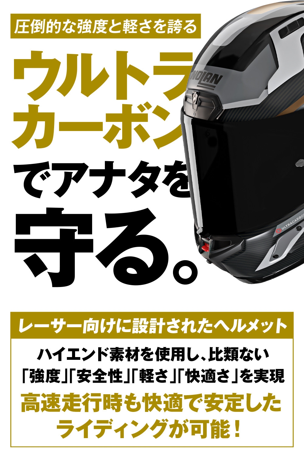 カーボンやアラミド繊維といったハイエンド素材を使用し、比類ない強度、安全性、快適さ、軽さ、そして空気力学はレーサー向けに設計されています。