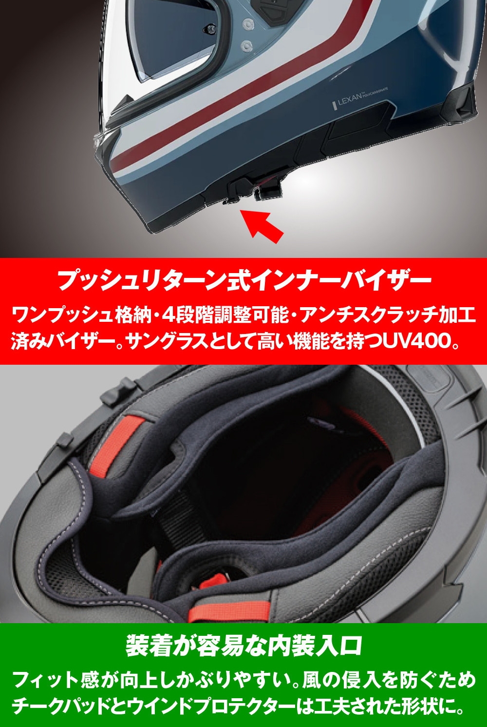 ボタンワンプッシュで収納可能なインナーバイザーは、サングラスとしての高い機能をもつUV400タイプ。4つの高さポジションが選べます。