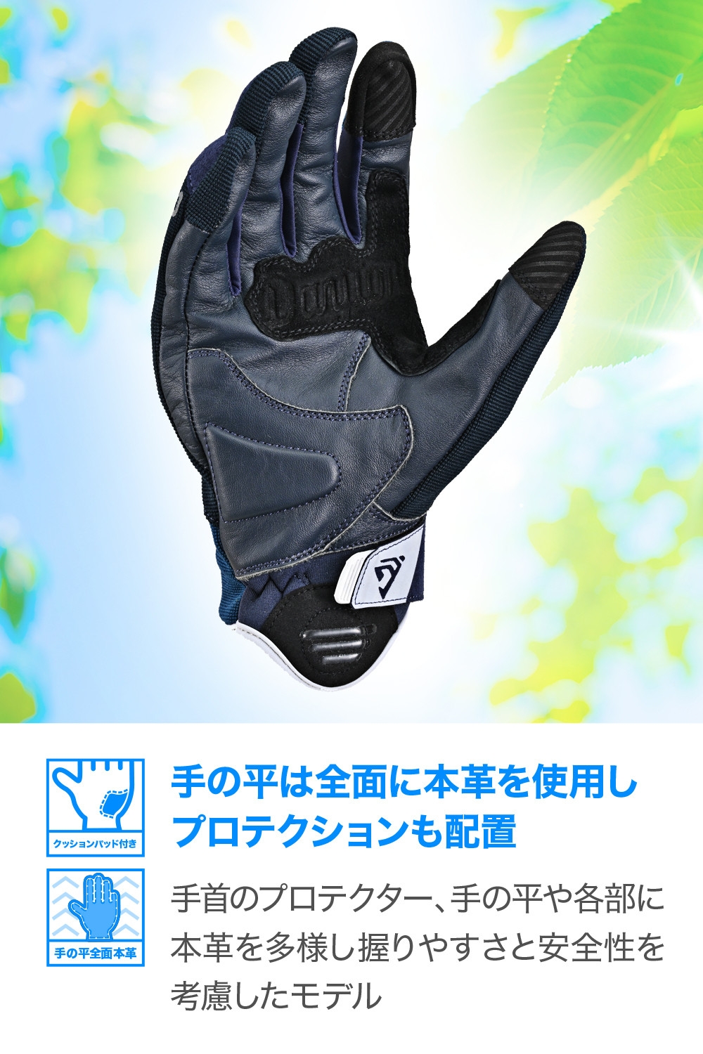 手のひらには本革を採用し、耐摩耗性と優れたグリップ性能を両立。