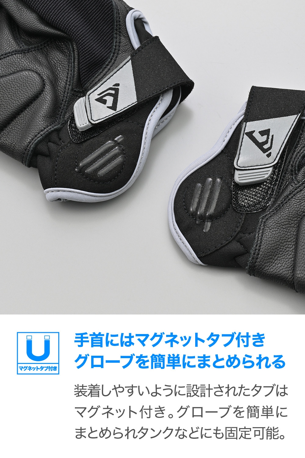 手首にはマグネット入りの引っぱりタブを採用。タンクなどに固定でき、左右のグローブをまとめて保管可能。