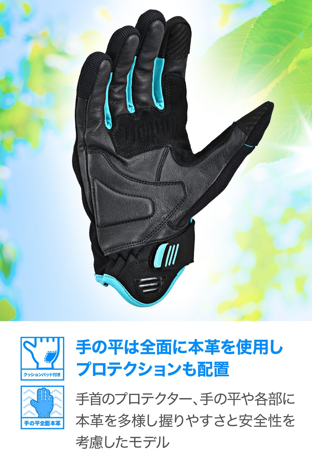 手の平には本革を採用し、耐久性とグリップ力を両立。