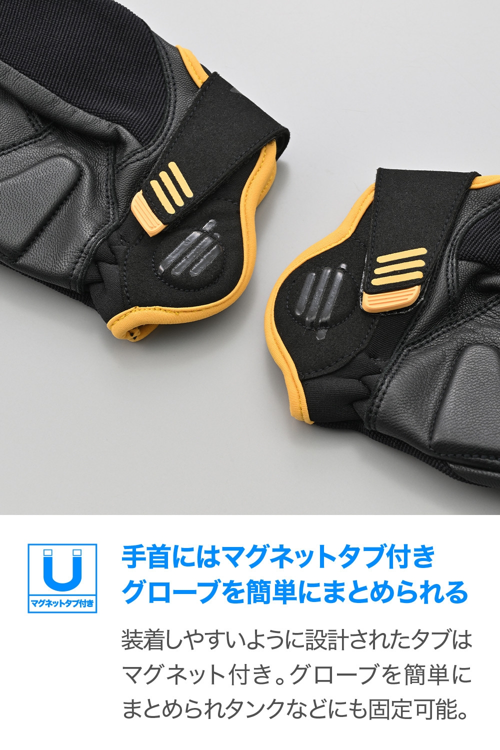 手首にはマグネット入りの引っぱりタブを採用。タンクなどに固定でき、左右のグローブをまとめて保管可能。