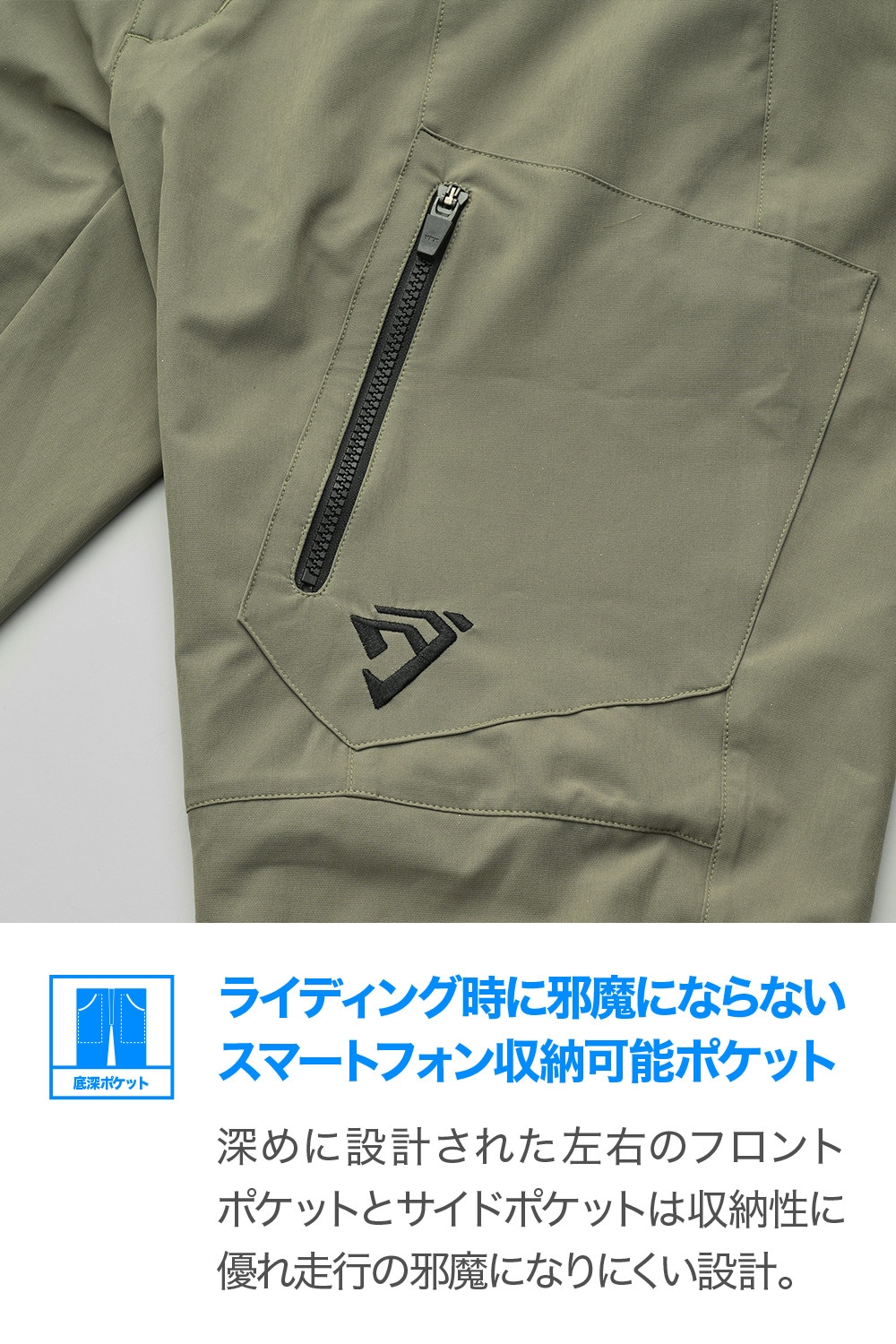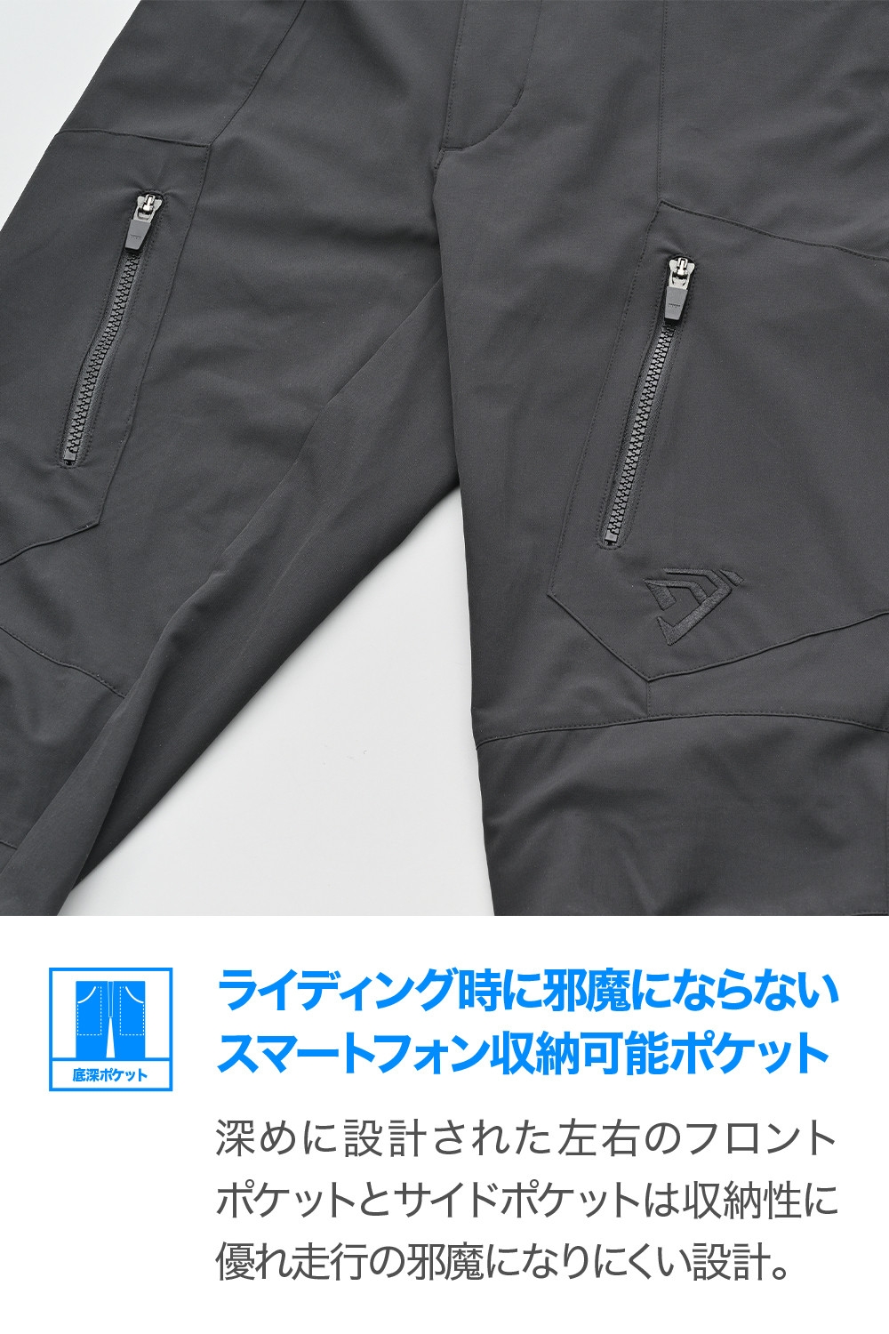 深めのフロントポケットと大型サイドポケットは走行の邪魔になりにくい設計。