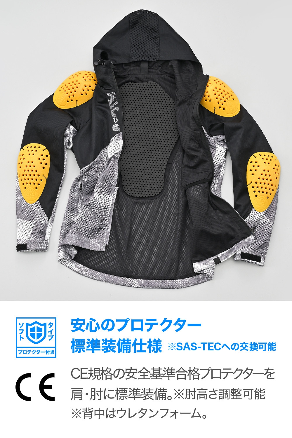 - プロテクター:肩 / 肘(CE規格)、背中(ウレタンフォーム)