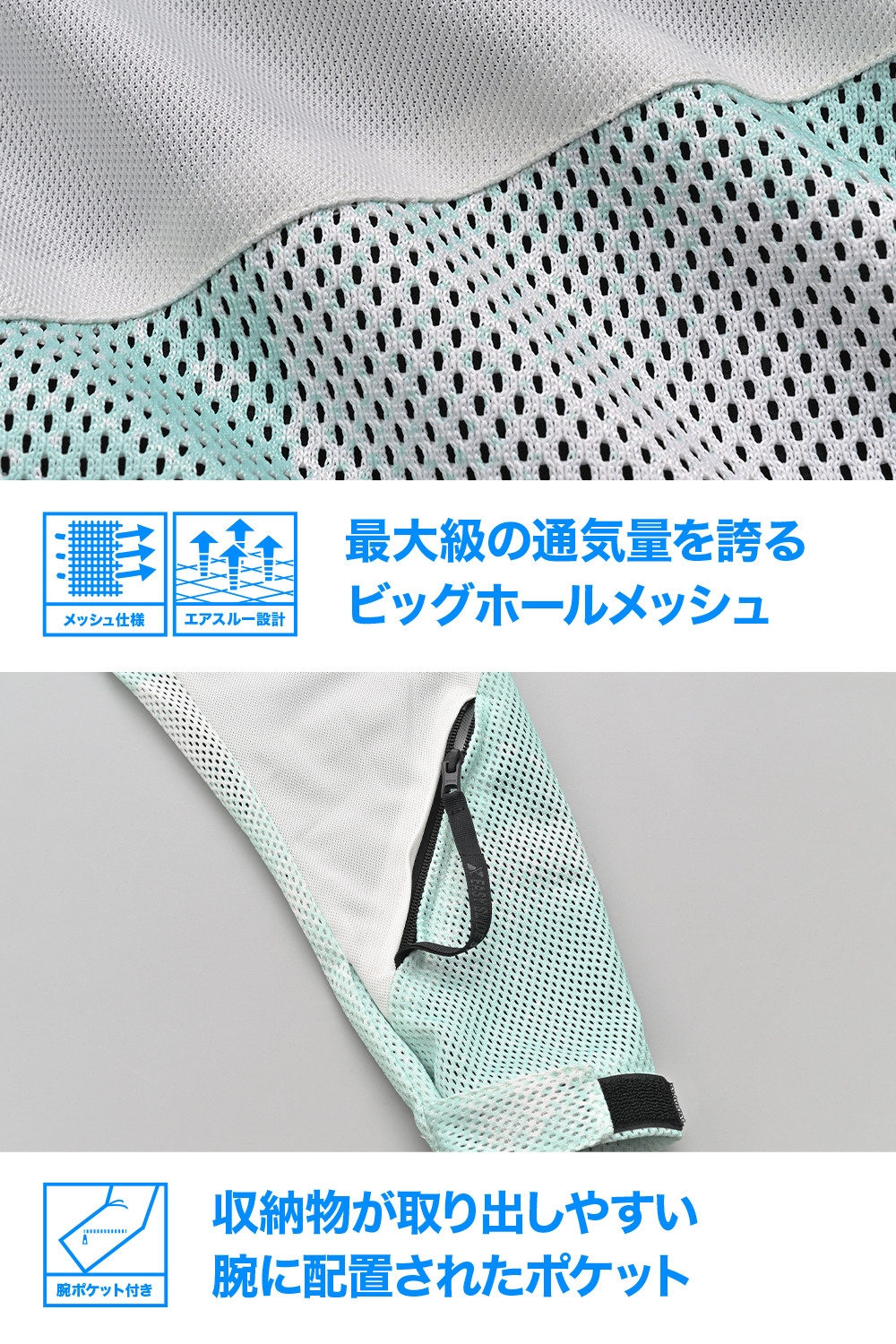 上部には伸縮性と肌触りに優れたジャージ系素材、下半分には最大級の通気量を誇るビッグホールメッシュを大胆に配置。
