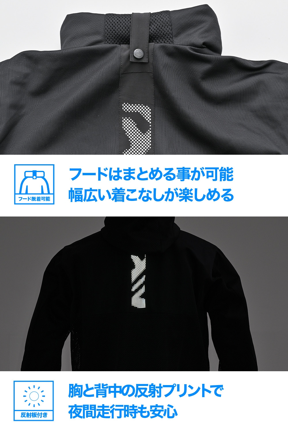 フードは収納式で、シーンや天候に合わせてアレンジ可能。
