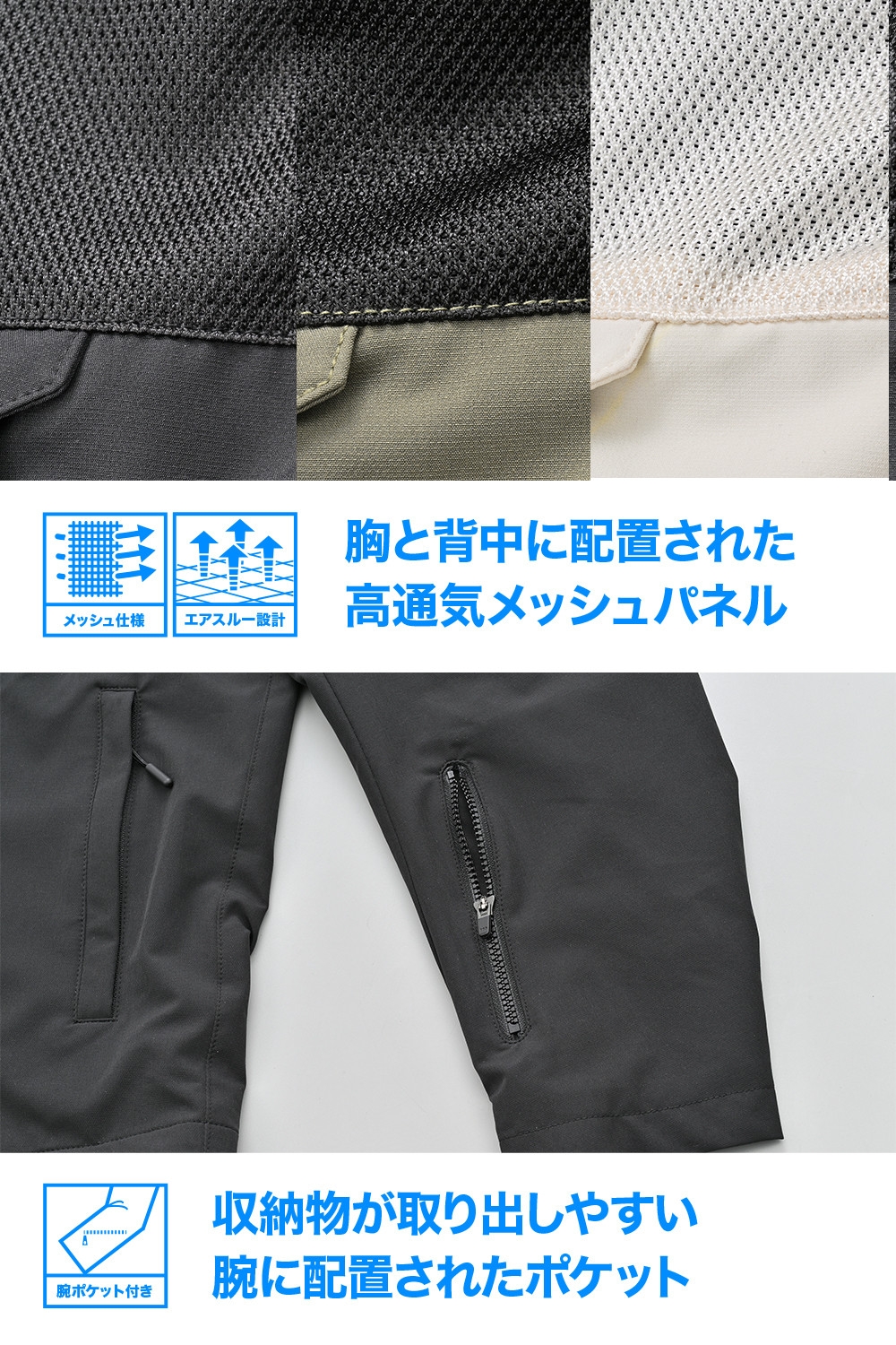 メッシュジャケットに抵抗があるユーザーでも着用しやすい印象に仕上がっています。