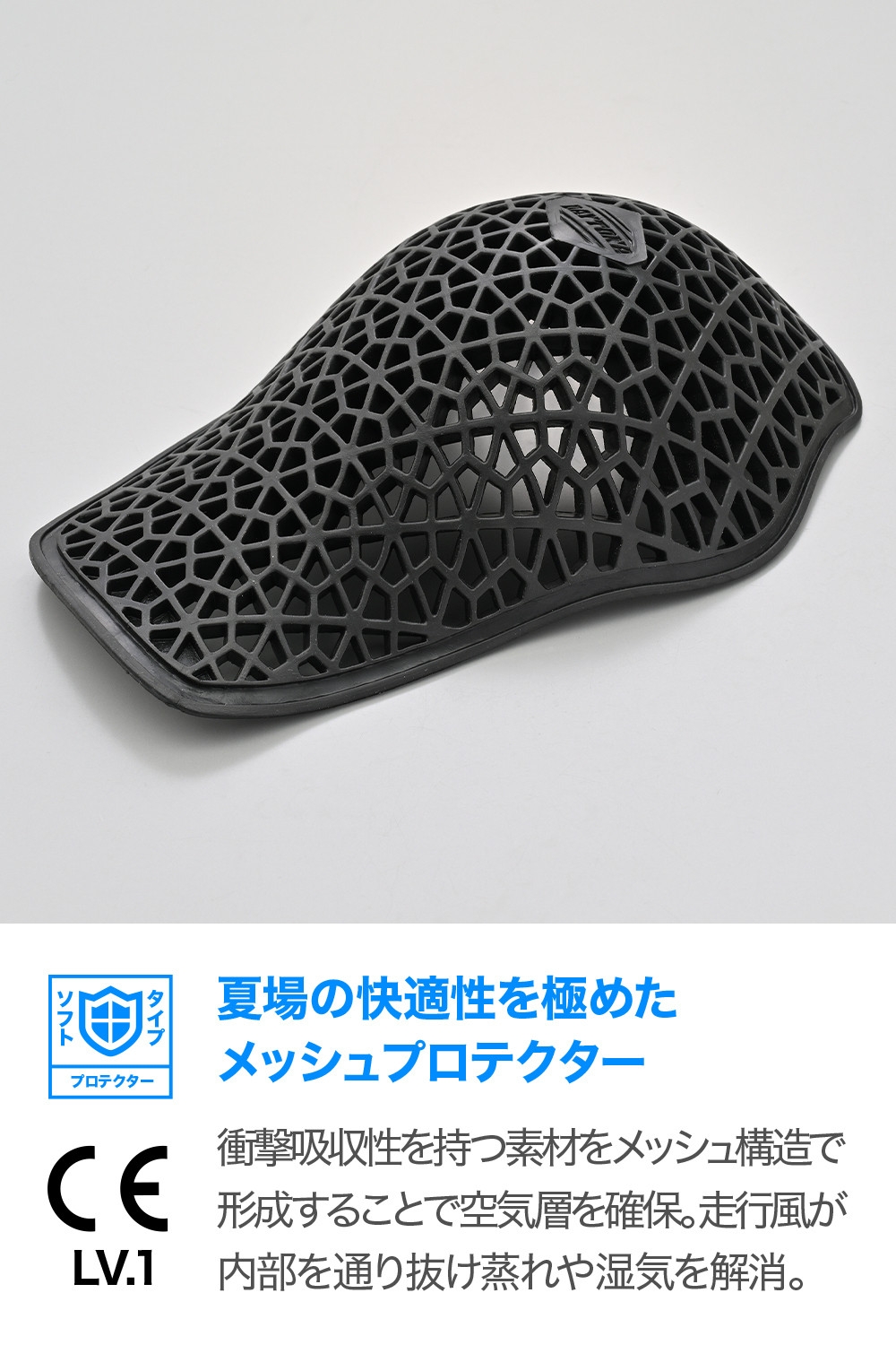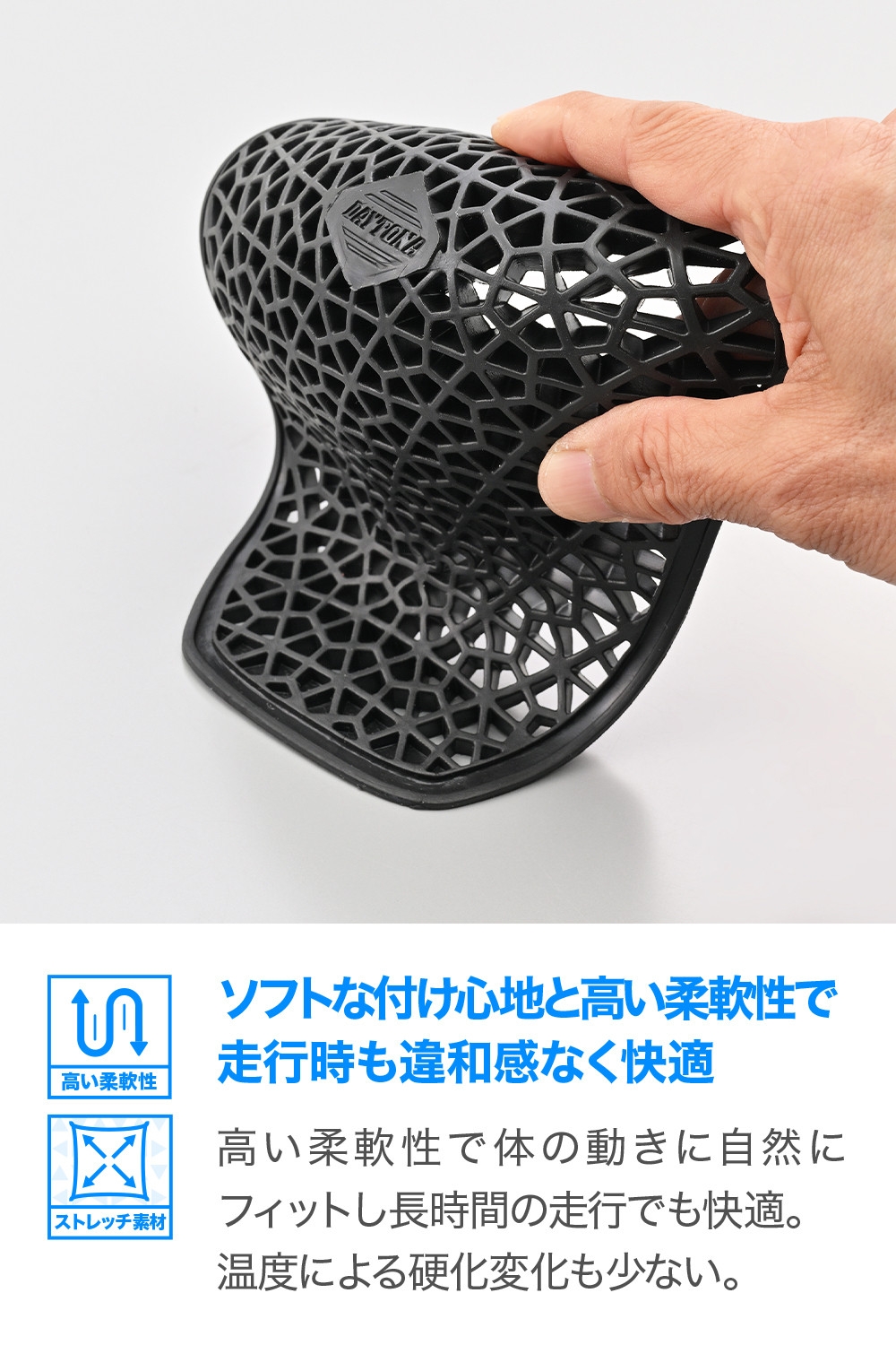 衝撃吸収性を持つ素材をメッシュ構造で形成することで空気層を確保。