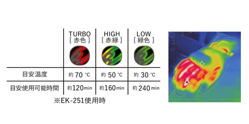 スイッチONですぐに発熱し断熱生地で熱を逃がさず指先までしっかりあたたか。薄型7.4Vバッテリーセット付き電熱グローブ。