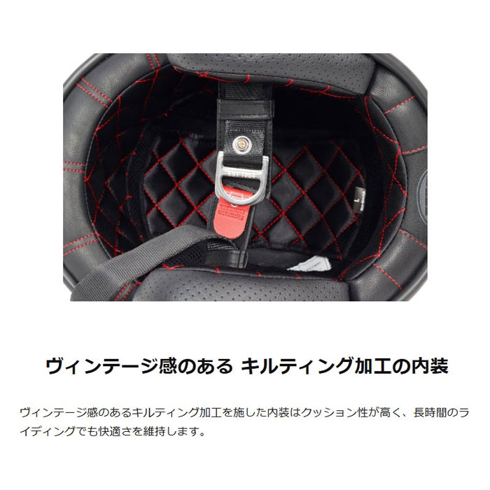 ヴィンテージ感のあるキルティング加工を施した内装はクッション性が高く、長時間のライディングでも快適さを維持します。