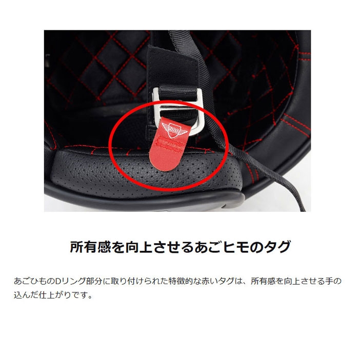 あごひものDリング部分に取り付けられた特徴的な赤いタグは、所有感を向上させる手の込んだ仕上がりです。