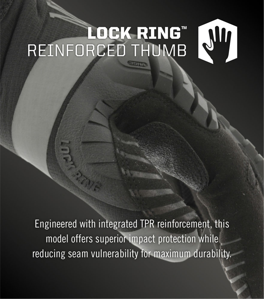0.8mm厚の合成皮革で手の自由な動きを実現しつつ、サーマル・プラスチック・ラバー (TPR) によりナックル部分から指先を保護します。