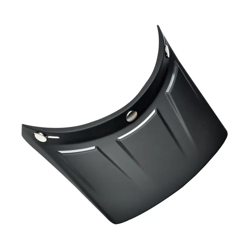 ホック3点止めで多くのヘルメットに装着可能な汎用性の高いロングバイザー。