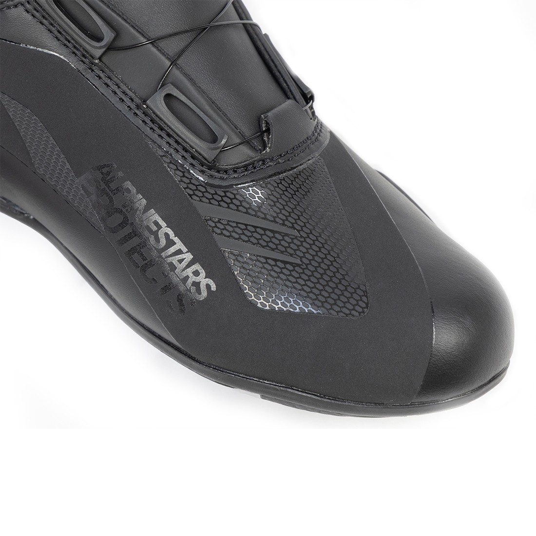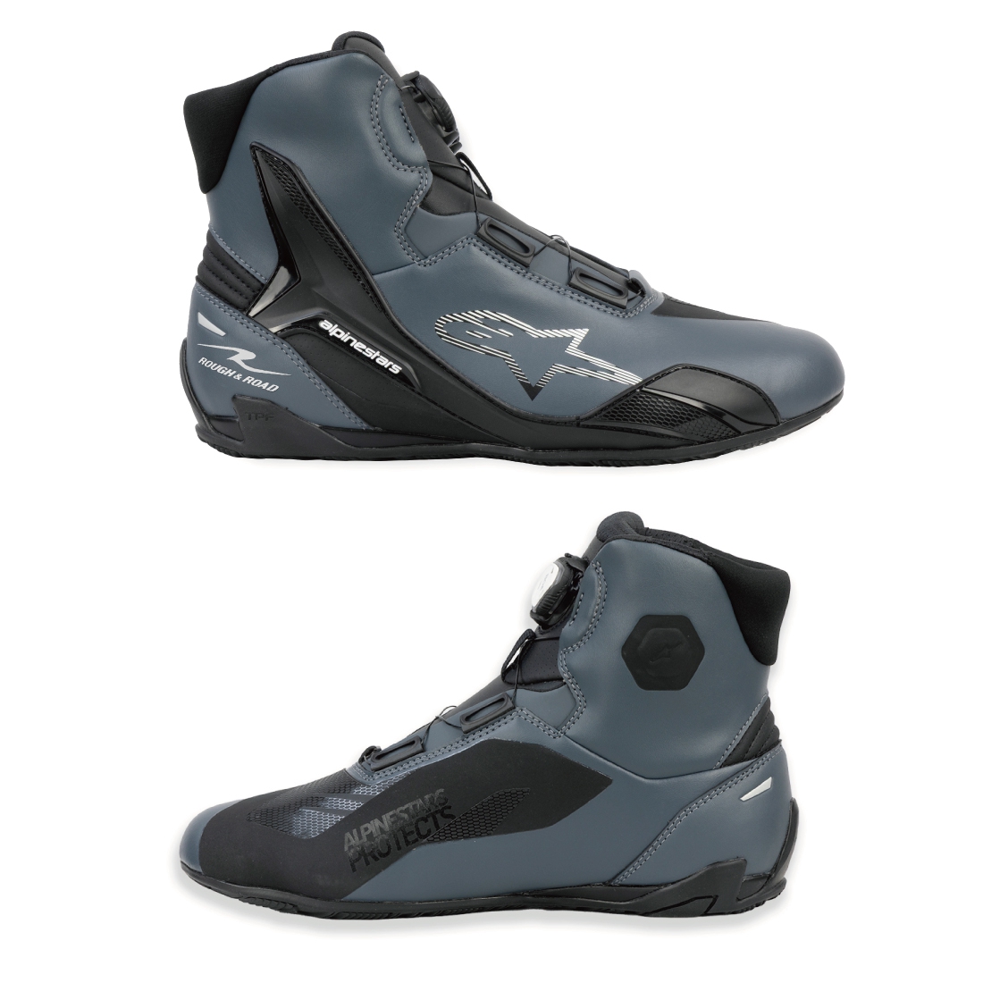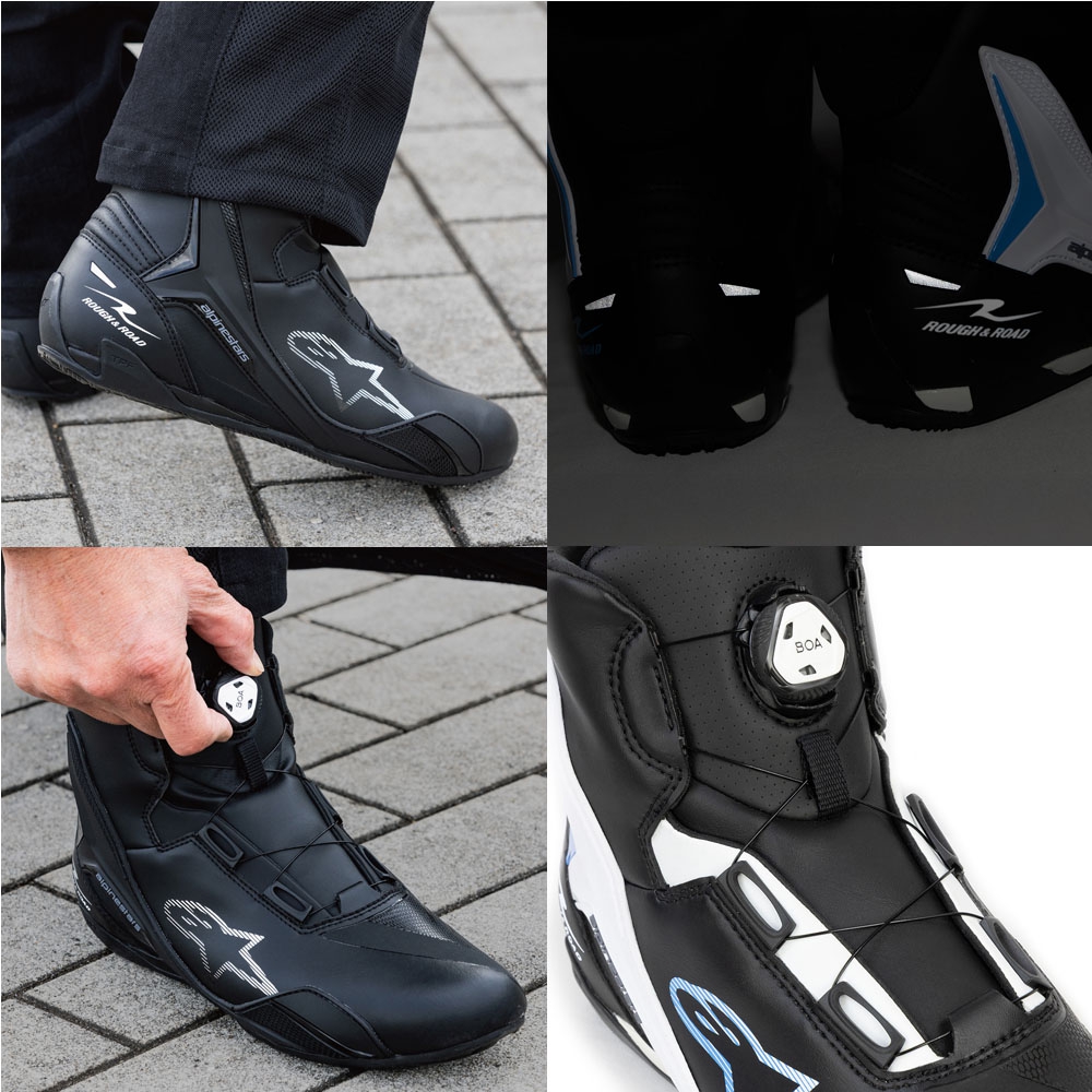 AlpinestarsとROUGH&ROADのコラボレーションオリジナルデザインの限定生産モデル。均一な締め付けと微調整が可能なBOA® Claw Jar Systemを採用し、通気性・快適性も重視したハイパフォーマンスシューズ。マイクロファイバーと熱溶着パネルの組合せで構成された無縫合構造アッパーは、通気性に優れた3Dメッシュや滑り止めマイクロスエードなどを適材適所に配置した、Alpinestars社が培った経験に基づいた本格設計。モータースポーツ用のブーツから着想を得ており、質感のあるグリップと優れた吸収性を提供する新型ラバーソール、人間工学に基づいたデザインのトゥボックス、カカトは柔らかなマイクロファイバーにより後方屈曲性を向上、ヒールカウンターの補強や、足首の内側を保護するデュアルデンシティープロテクターなど多種多様なプロテクション性能は、本格設計を裏付ける充分なスペックです。