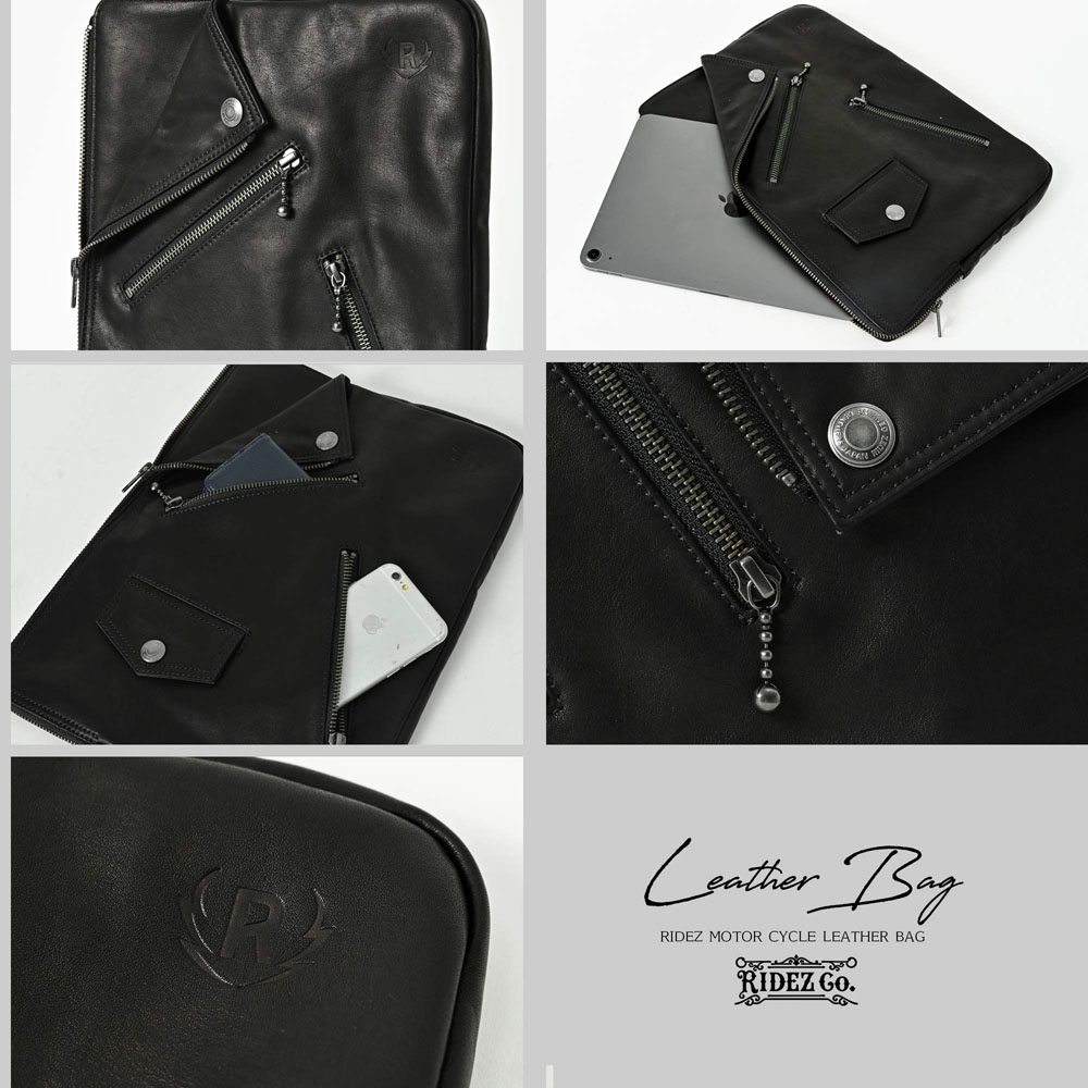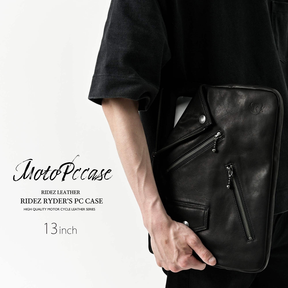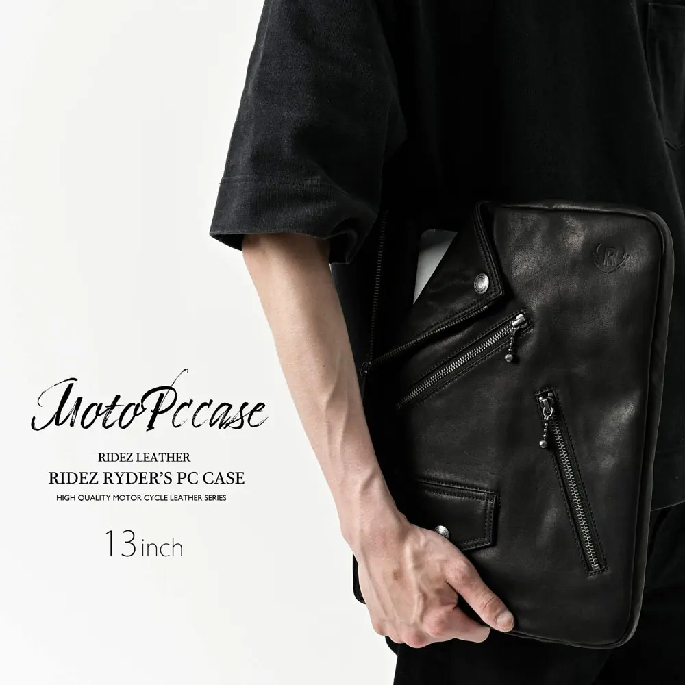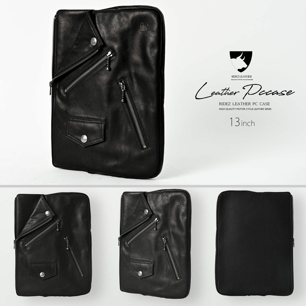 クラシカルなレザージャケットをリバイブし、PCケースとして新たに形にしました。他にはない圧倒的な存在感。RIDEZ が“革でPCケースを作ったらどうなるのか”という新しい挑戦から生まれたアイテムです。13inchのパソコンに対応し、もちろんタブレットケースとしても活用できます。普段でもライダースのスピリッツを忘れない、唯一無二の PCケースです。