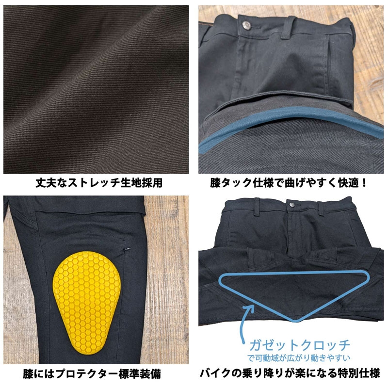 生地もストレッチ性のある素材を選ぶ事で、ライディング時の姿勢にも無理なく履き続けることを可能にしました。